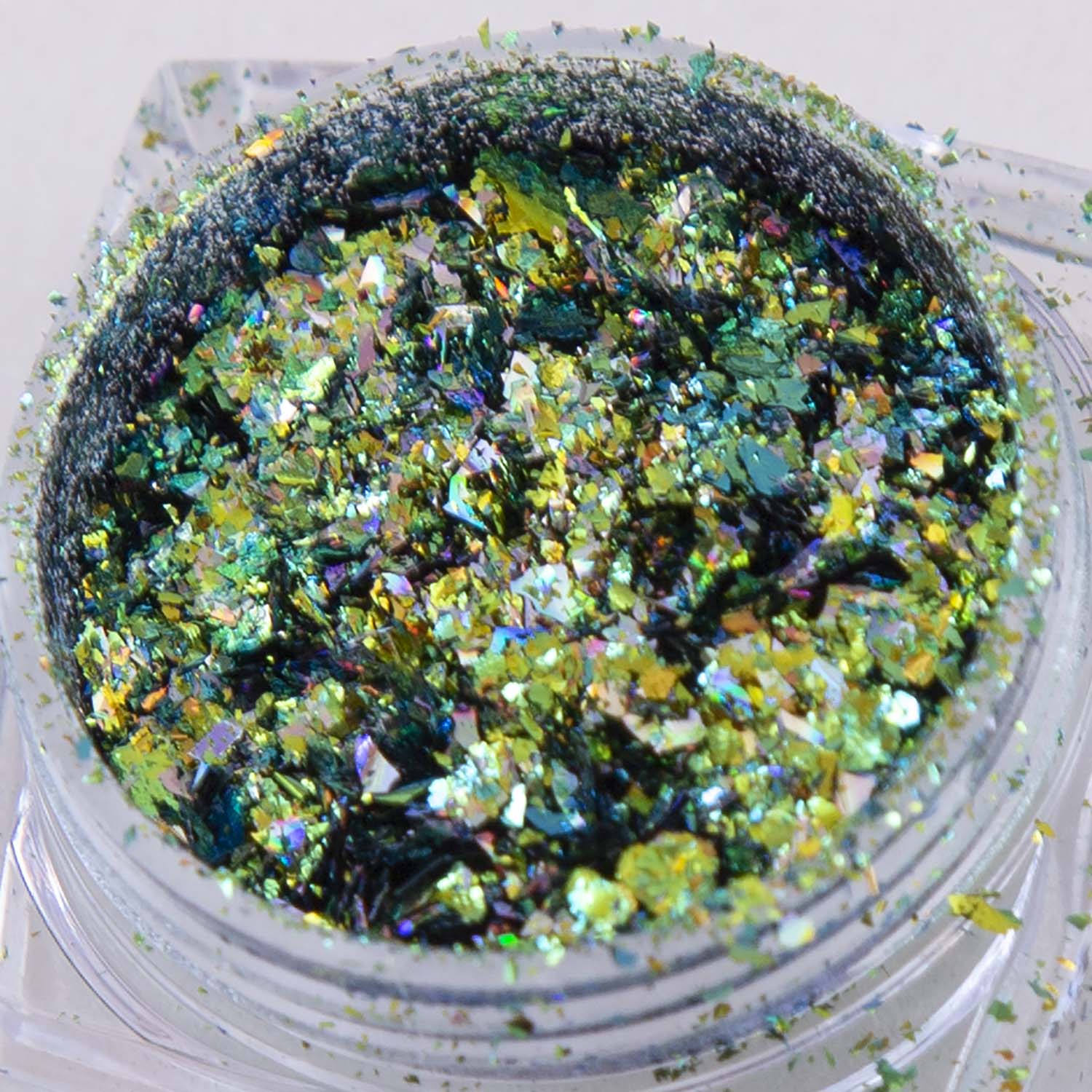 Put a little sparkle on your manicure with our Flashy Flakies! These swamp green iridescent flakies shine bright with flecks of green and golden yellow. Each little pot contains a net weight of 0.3 grams.