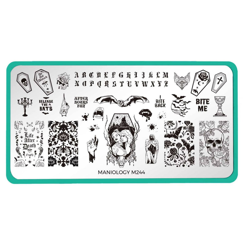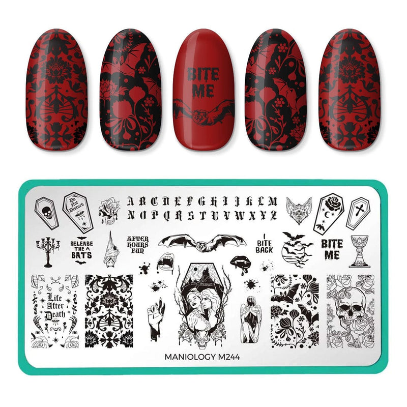 Take your nail stamping game to the necks level with a little after hours fun. This wicked plate features designs inspired by vampires in the Victorian fashion. Slay your next manicure with bats, coffins, vampy expressions, and gothic lettering.