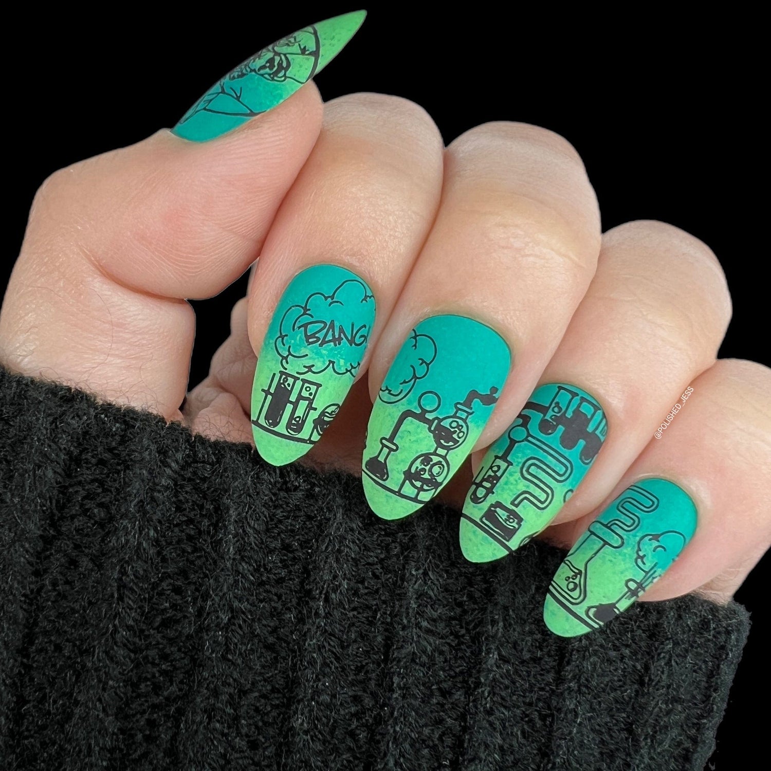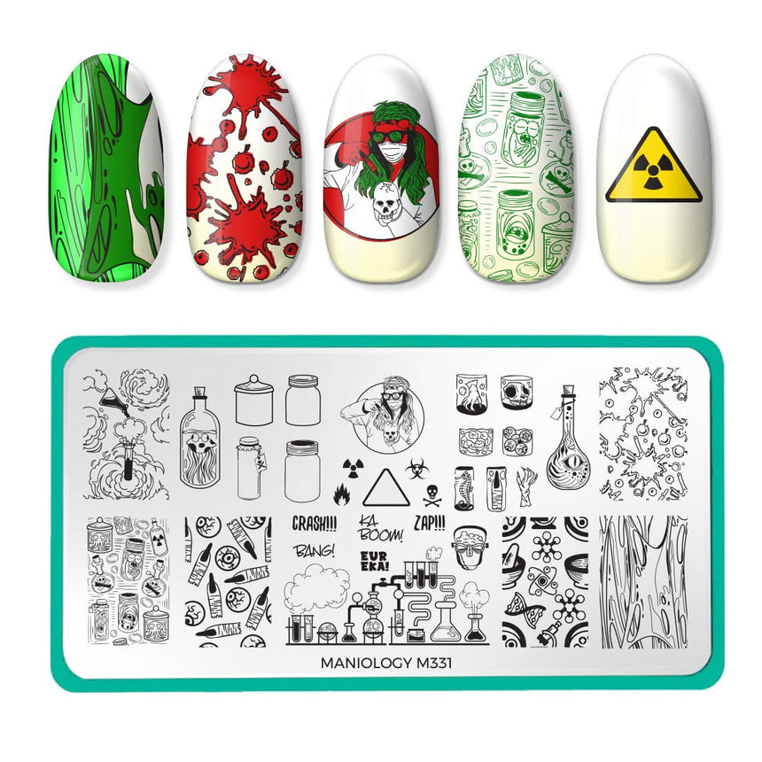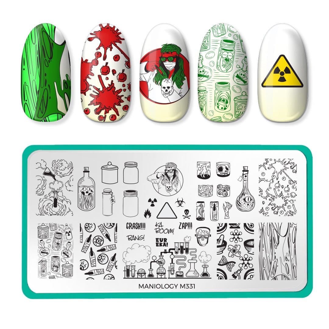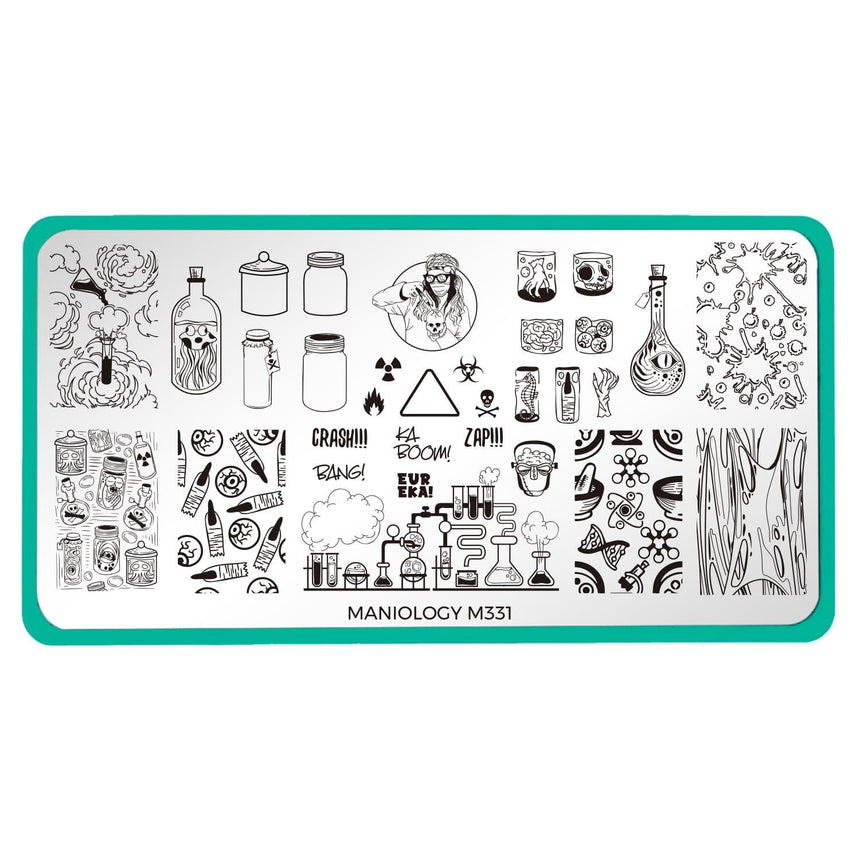 Let's do a little nail experiment...! Explore your strange curiosities with our Mad Scientist (m331) stamping plate. From DNA strands to laboratory equipment, this plate features fizzy-fun designs perfect for showing off your love for science. So get ready to experiment and mix up some magic for a bubbly-blast nail art!
