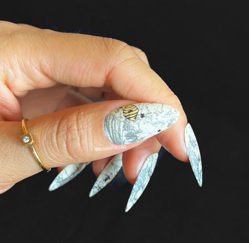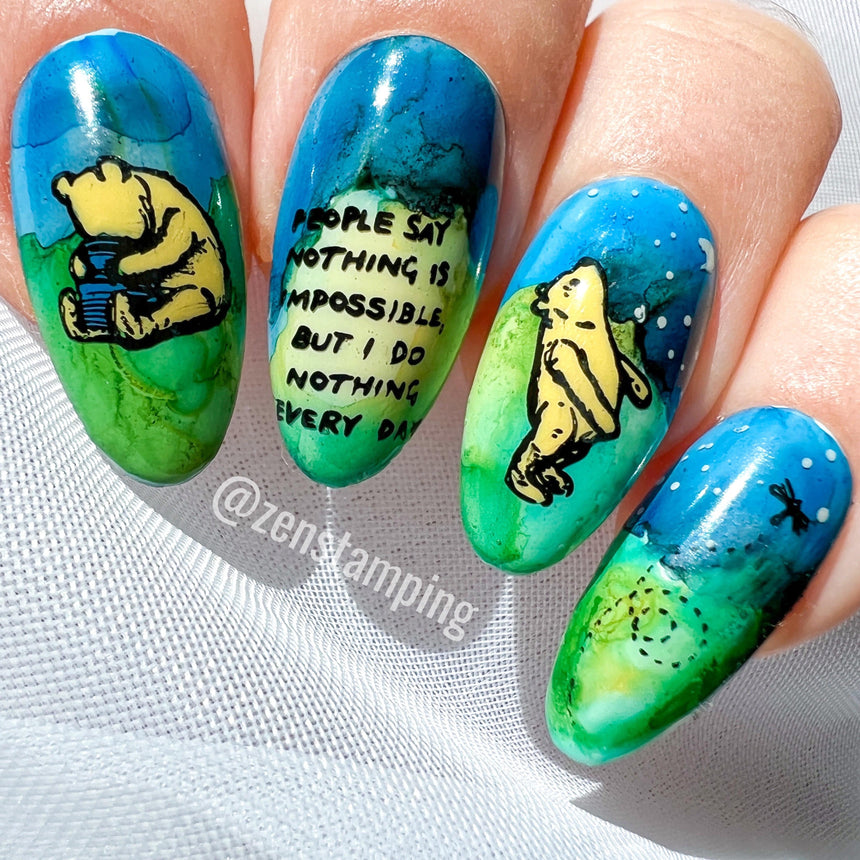 Ever wish you could bottle the joy of a lazy day with friends in the woods? Let your nails wander through the Hundred Acre Wood, where every buzzing bee and hunny-smeared moment is stamped in storybook charm with Hunny Trails stamping plate, bringing you back to storybook scenes and childhood joy. You'll find buzzing bees, dripping honey, floating balloons, and our favorite cuddly bear on his endless search for hunny. Dip into the honey pot and stamp out a little nostalgia.