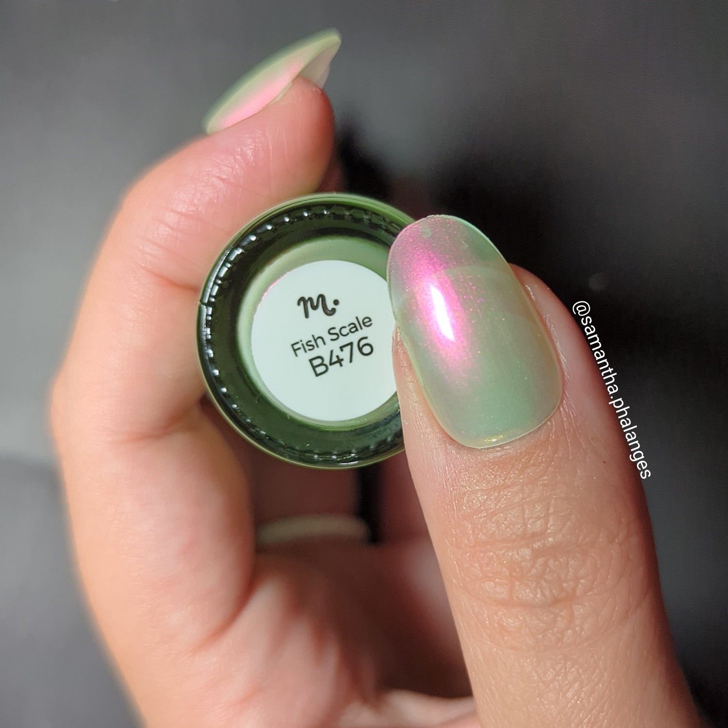 Fish Scale (B476) stamping polish is a beautiful green hue with a pearlescent, duochrome effect. This polish shifts from green to pink and has a subtle pearl-like sheen when applied to the nails.