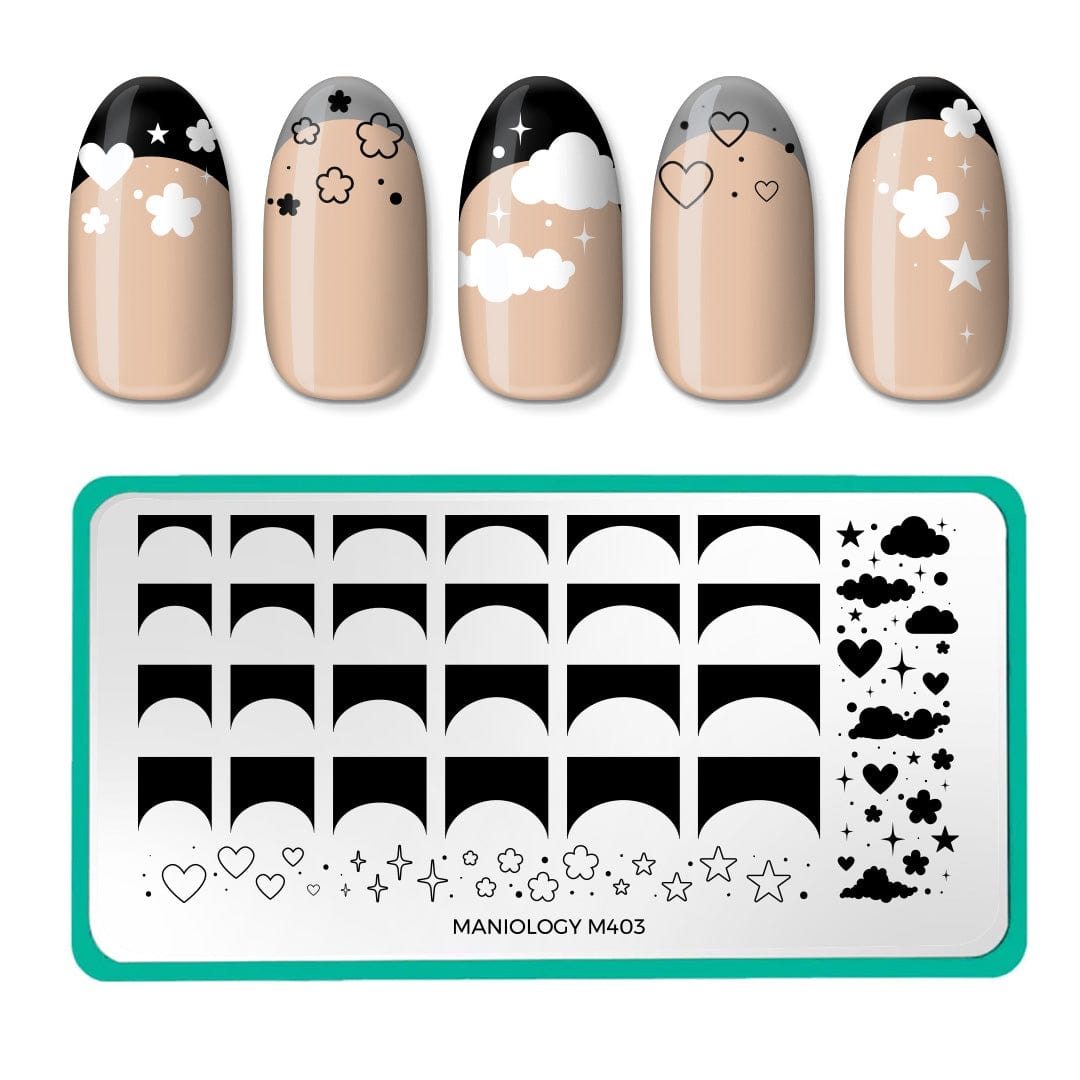 Just when you thought french tip nails couldn't get any cuter...! Transform your french manicure with cute, dreamy cloudscapes using this French Cloudscape stamping plate. Featuring dainty French tip designs and adorable cloud nail accents, this plate lets your nails soar into a whimsical sky. Playful clouds, stars, and hearts take your nails on a journey to cloud nine! With a delightful selection of cute kawaii designs, this plate offers endless creativity, allowing you to create manicures straight out of a dream.