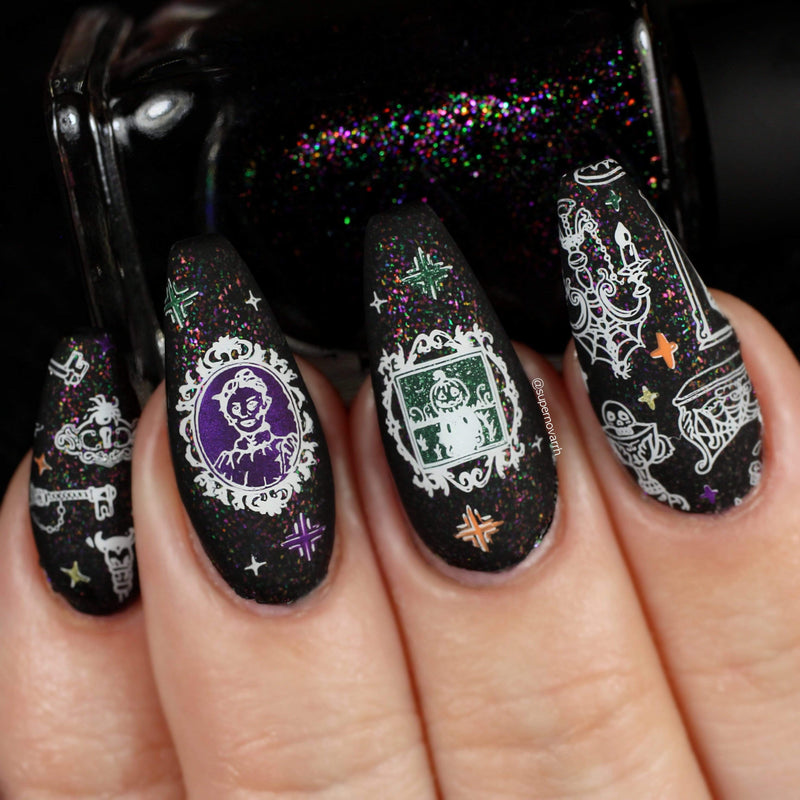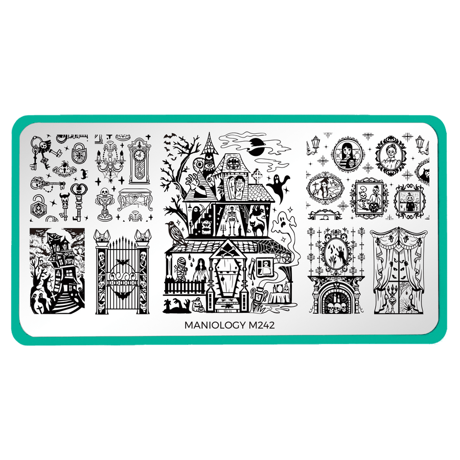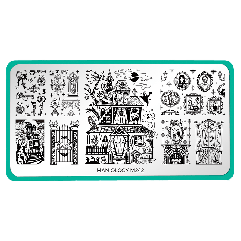 You are cordially invited to our Halloween celebration. Make yourself at home in Maniology manor. Don't mind the cobwebs. This homely stamping plate is embellished with victorian inspired decor and a hall of peculiar portraits. (Don't stare too long.) Warm up your frigid fingertips in our fireplace or unlock your creativity with one of many skeleton keys. Make yourself at home and get creative with your Halloween manicures.