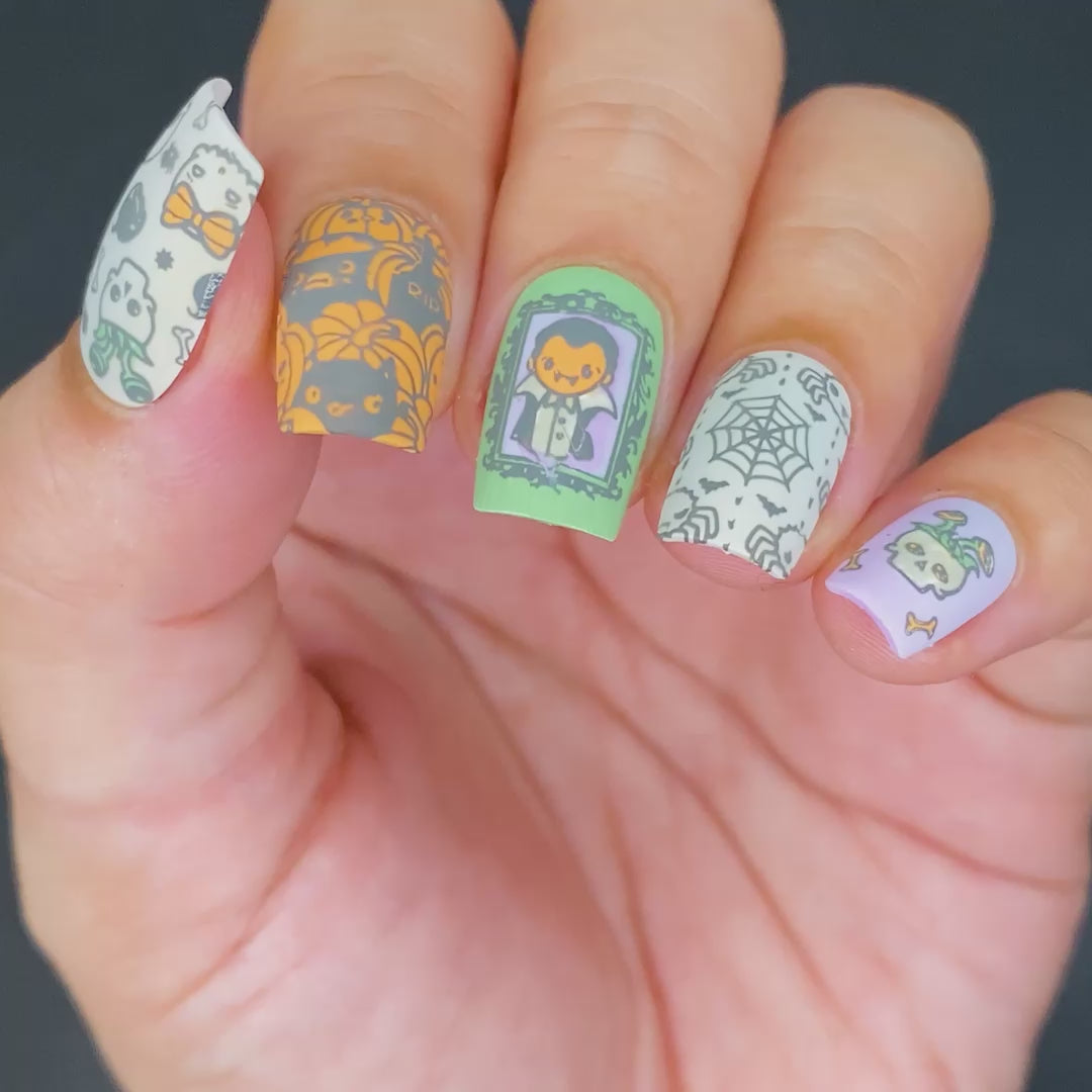 We're bringing the boos this Halloween with our Friendly Ghosts (M311). This nail stamping plate is completely haunted with friendly ghosts that are too cute to spook! With tons of cute phrases, full nail patterns, and accent designs, this plate will help you create drop dead gorgeous nails!