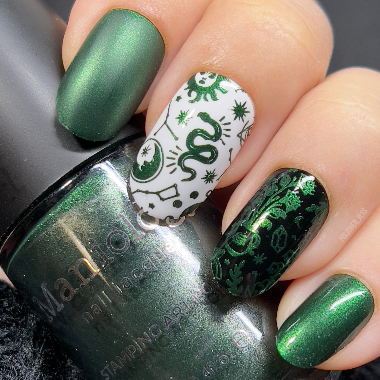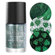 If looks could kill, Poison (B309) would be the lethal weapon. This deep emerald green stamping polish has a deadly touch of metallic silver. Stamp over your favorite base color or paint over the entire nail for flawless full coverage.
