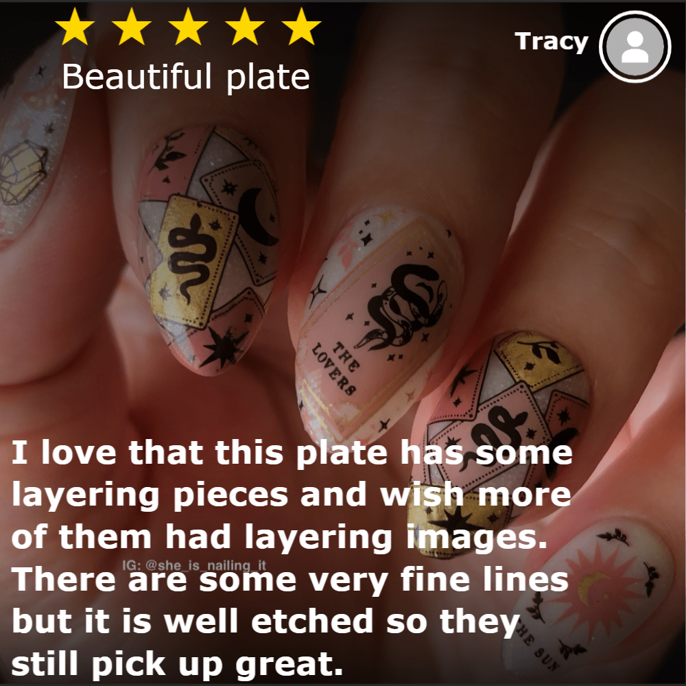 Bring your tarot readings to life with this Celestial Tarot stamping plate. Created in collaboration with @Anesayart, this plate features designs inspired by tarot cards, crystals, and the profound energy of the major arcana. From the elegant Empress to the enigmatic Moon, each tarot nail stamp holds cosmic message, imprinting your nails with spiritual energy. Layer frames with your chosen cards and let your nails reveal your cosmic path.
