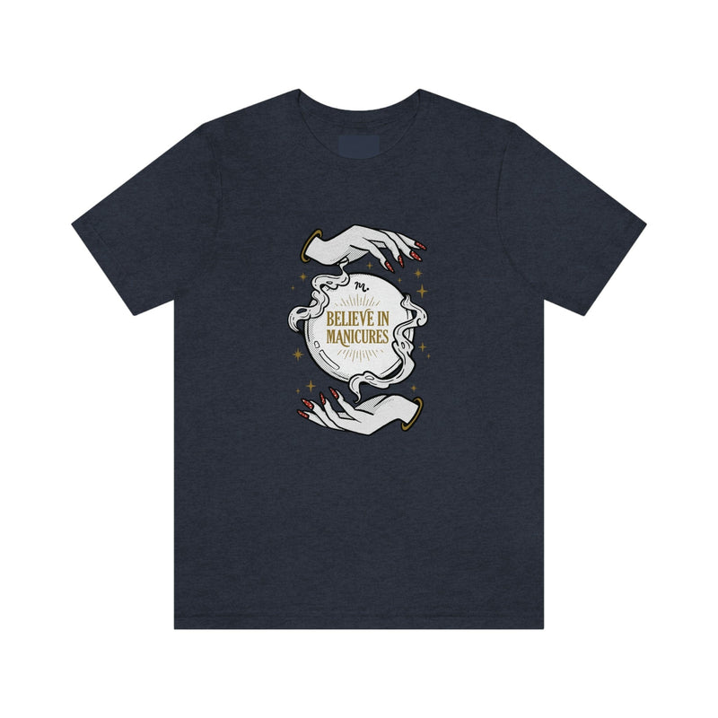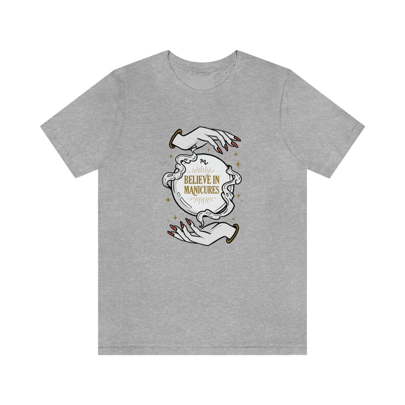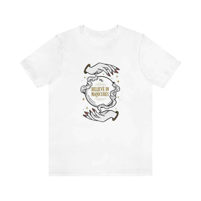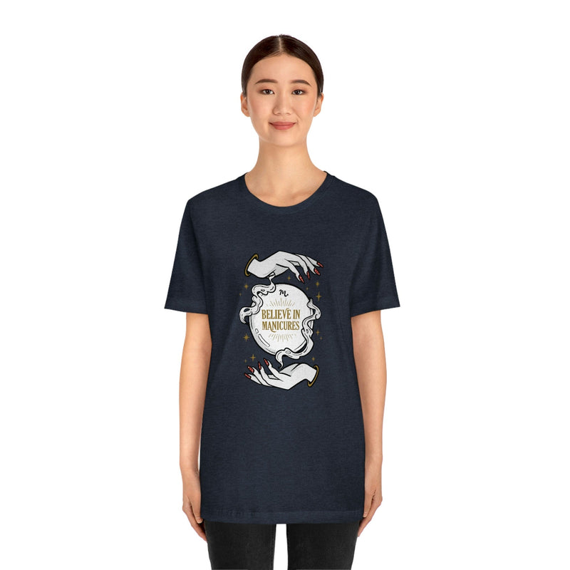 Summon your creative spirit. If you're a mystic soul who practices a bit of mani magic, our "Believe in Manicures" design is the perfect addition to your wardrobe. This fun and stylish unisex design is a great way to show off your love for the craft. Wear it for a boost of confidence, style, and inspiration every day!