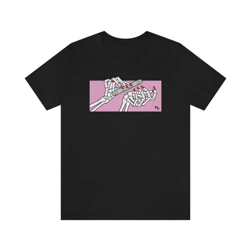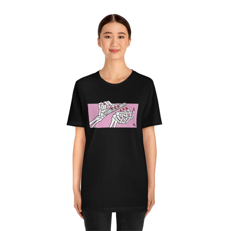 You don't have to be a nail art expert to rock this shirt! Our "Dead But Nailed It" design is a conversation starter. It's a bold and hilarious addition to any closet, and is sure to be your go-to for casual days. Plus, it's comfortable enough to wear all day long while you work on perfecting your next manicure. Bring a little life to the afterlife with this stylish and edgy t-shirt!