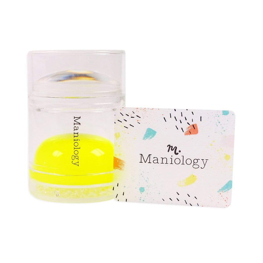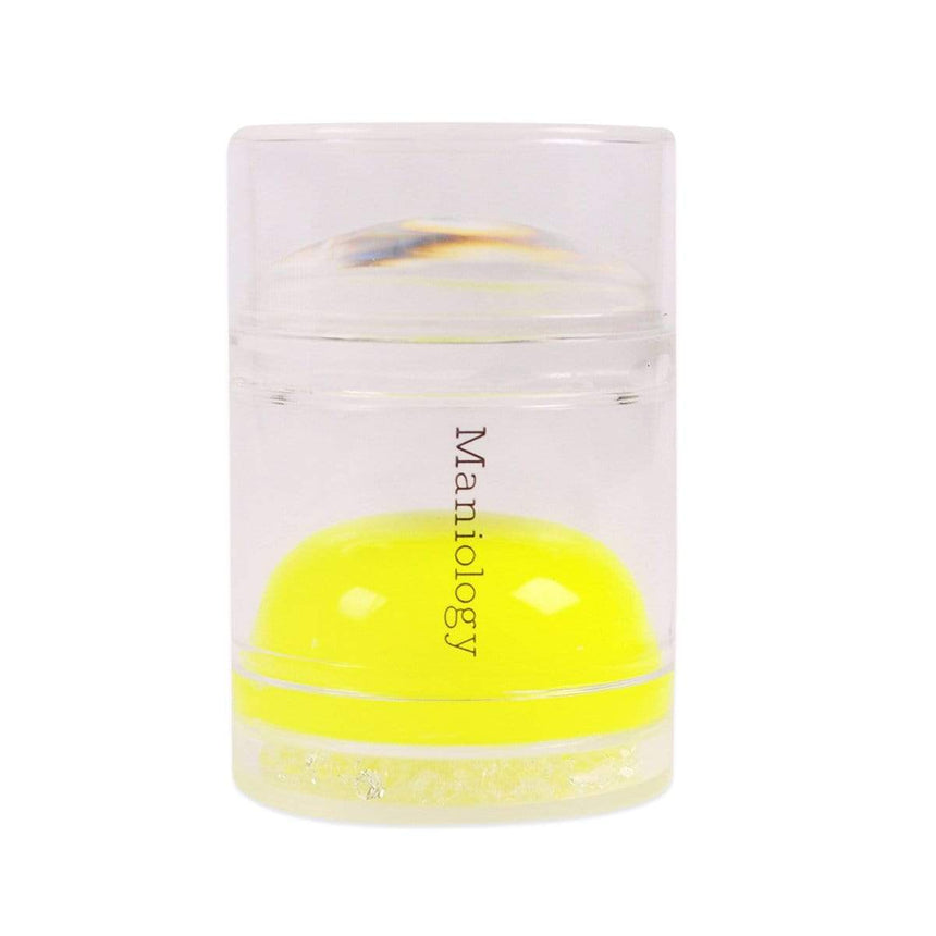 - Place the squishy yellow stamper head onto the cap of a Maniology stamping polish bottle. (Make sure your polish bottle is completely closed.)