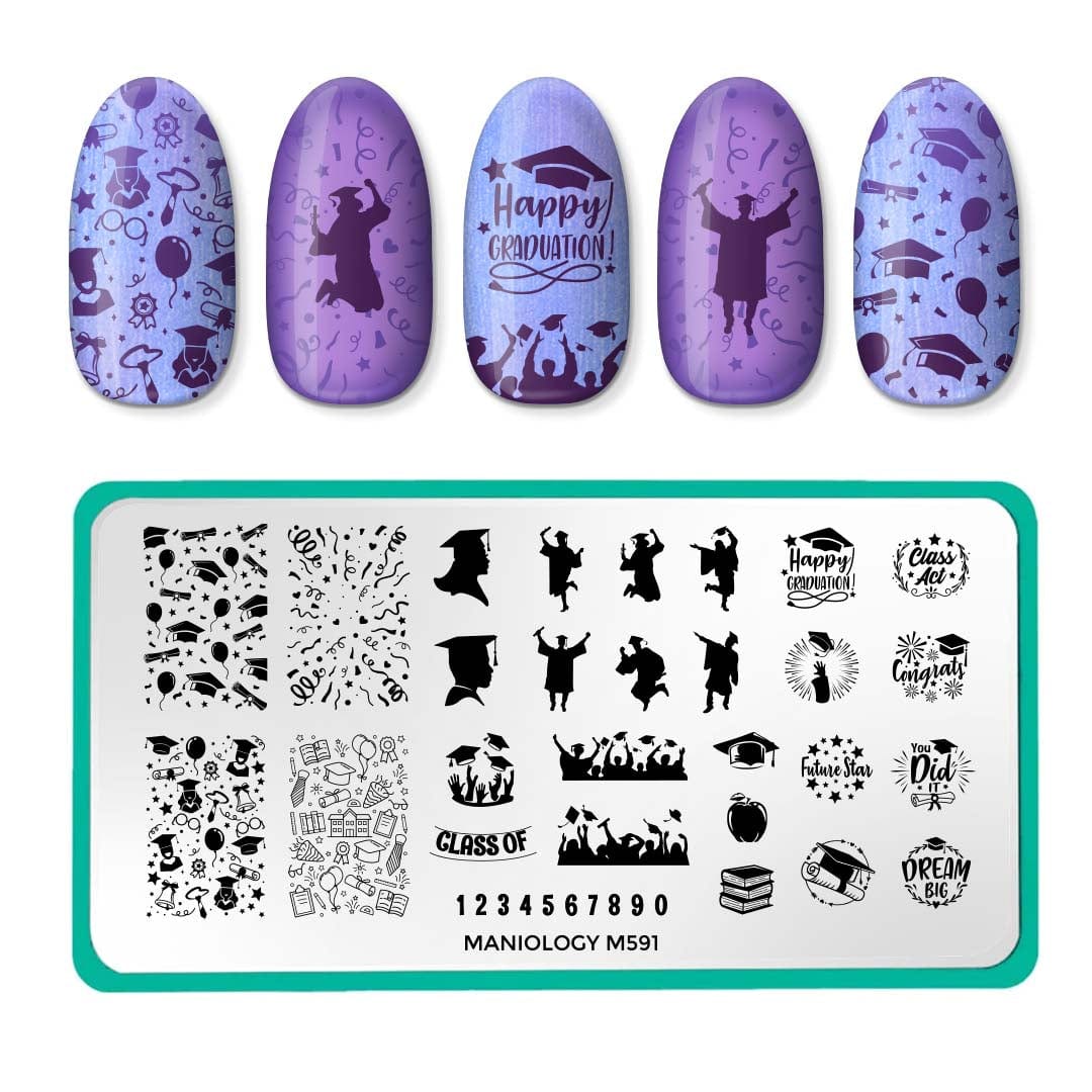 From finals to fingertips—you nailed it! Graduation is your glow-up moment—and your nails should be ready to celebrate. Wear your moment proud and celebrate the milestone with our Happy Graduates stamping plate. Featuring a lineup of festive graduation designs including proud graduate silhouettes, flying caps, diploma scrolls, party confetti, plus celebratory phrases, and even a full set of customizable class year numbers so you can stamp the year loud and proud! This plate is all about that proud, polished, ready-for-the-world energy. Stamp it. Flaunt it. And don’t forget to toss that cap with perfectly polished hands.