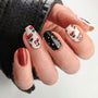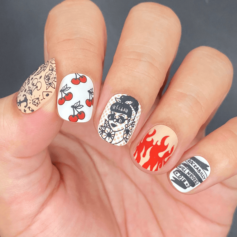 Light up your look with a manicure to match. 🔥🔥🔥 This rockabilly and pin-up inspired stamping plate includes firey full nails and ripe accents. Create vampy vintage looks, retro 50's glam, or undead punk manicures all on one plate!