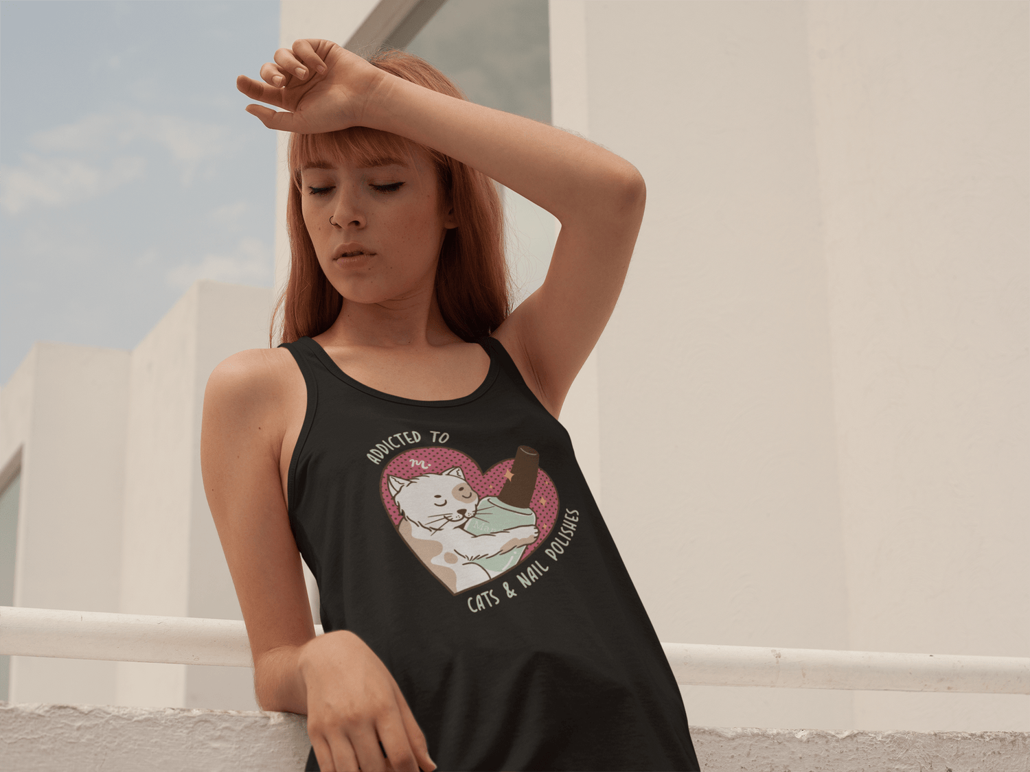 Declare your undying love for cats and fabulous nails with our "Addicted to Cats and Nail Polishes" tank top. Featuring an irresistibly cute design, this top is an instant mood lifter. Its soft fabric and relaxed fit provide the perfect combination of comfort and style, making it a go-to choice for enjoying a day out or simply lounging around. This must-have top will help you stay cool, comfortable, and stylish all day long!