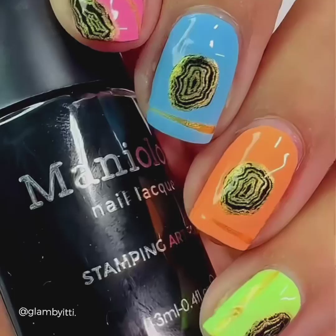 Our Agate stamping plate offers layerable designs inspired by the rich textures and lines of real agate stones. With delicate striations and organic textures, this plate creates an earthy charm that's natural and refined. Each design is perfect for layering, so you can get that rich, textured rustic look. Get creative with your color combos, and watch your nails take on the richness of real agate! Add some earthy tones for a relaxed, bohemian look, or go vivid with jewel tones.