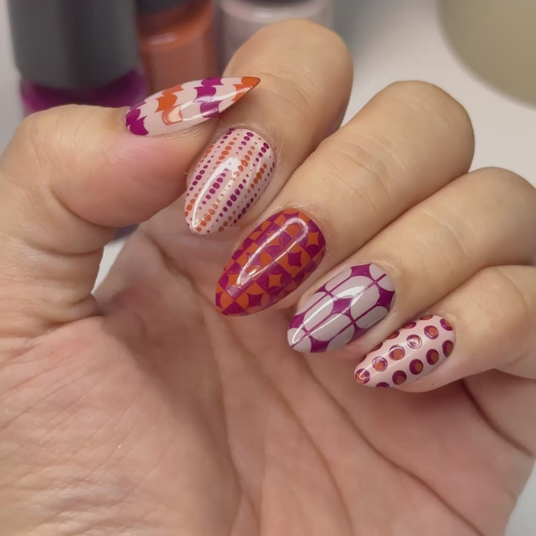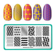 All-over patterns for those who want edge! Our Alt Aesthetic stamping plate packs bold geometric lines, checkered patterns, contrast circles, sharp squares, diagonal bars, stacked flowers, and optical illusions. Every design is full-coverage, ready to dominate the whole nail. You get high visual impact when you stamp with contrasting colors like black and white or mix matte with gloss finishes for extra depth. Play with contrasts and let your mani go all-out graphic!