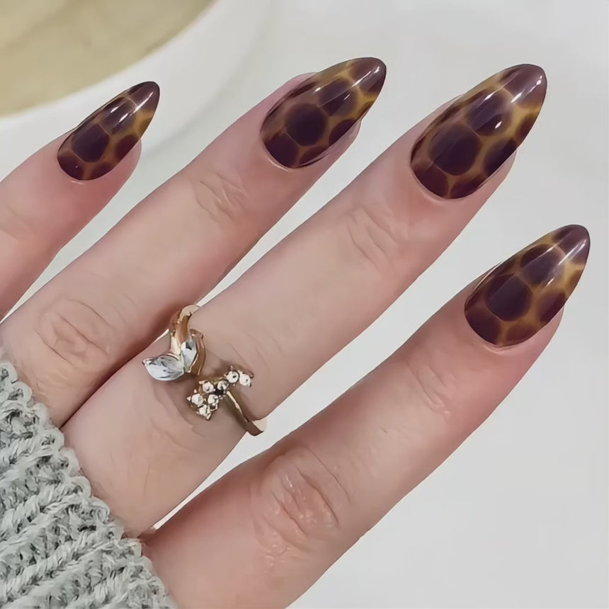 Inspired by the rich tones of amber, these Amber Shell Press On Nails feature a gorgeous shell-like pattern in warm hues and a flattering short almond shape.