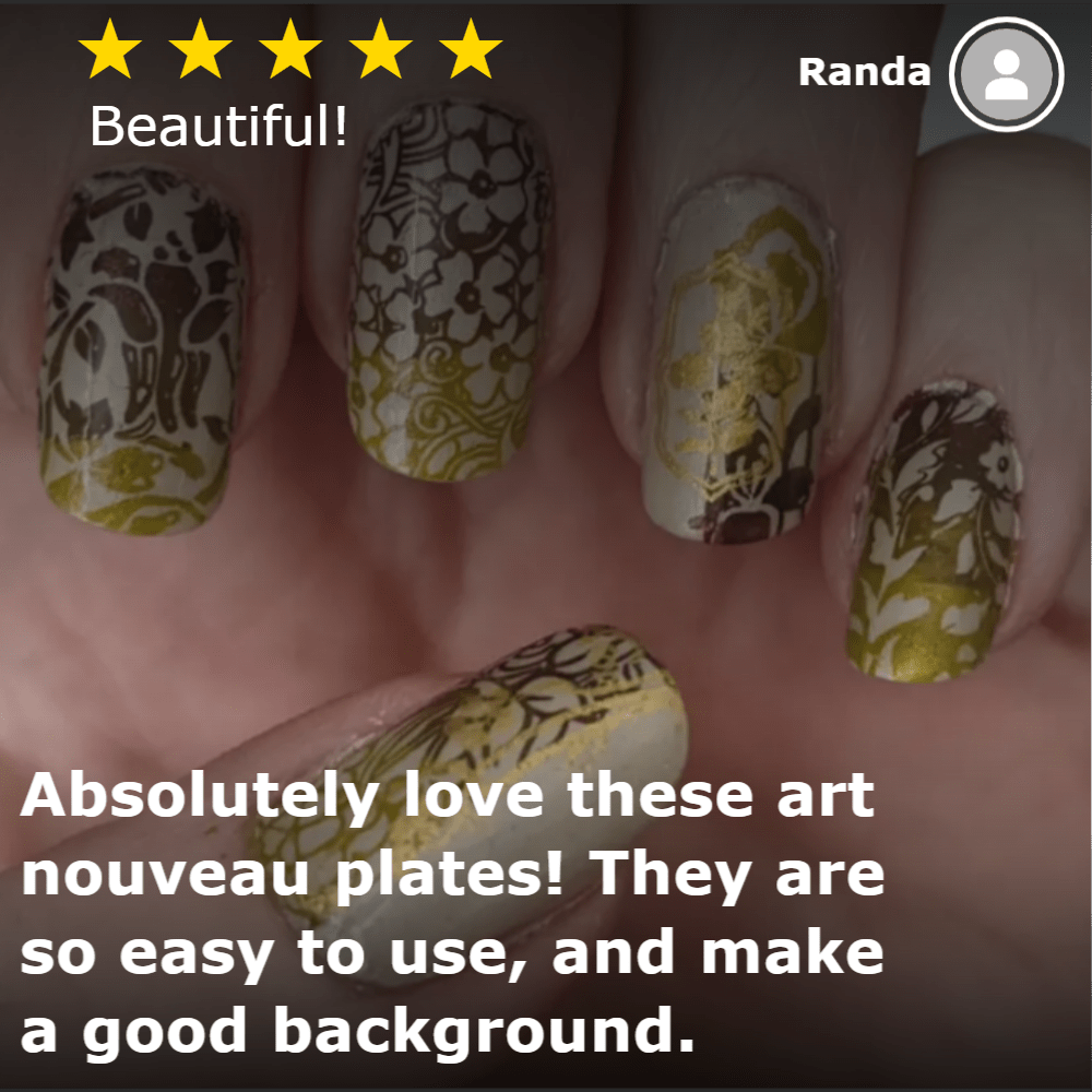 Our Art Nouveau stamping plate is filled with delicate swirls and curves that mimic the grace of real flowers inspired by art deco era of the late 19th and early 20th centuries. Explore the beauty of intricate floral designs, sinuous winding vines, and soft curves that define the romantic floral aesthetics of the Art Nouveau era inspired by artists such as Alphonse Mucha and Gustav Klimt. This whimsical floral plate offers a diverse selection of full nail and accent style floral-inspired designs, allowing you to create a beautiful floral garden on your nails.
