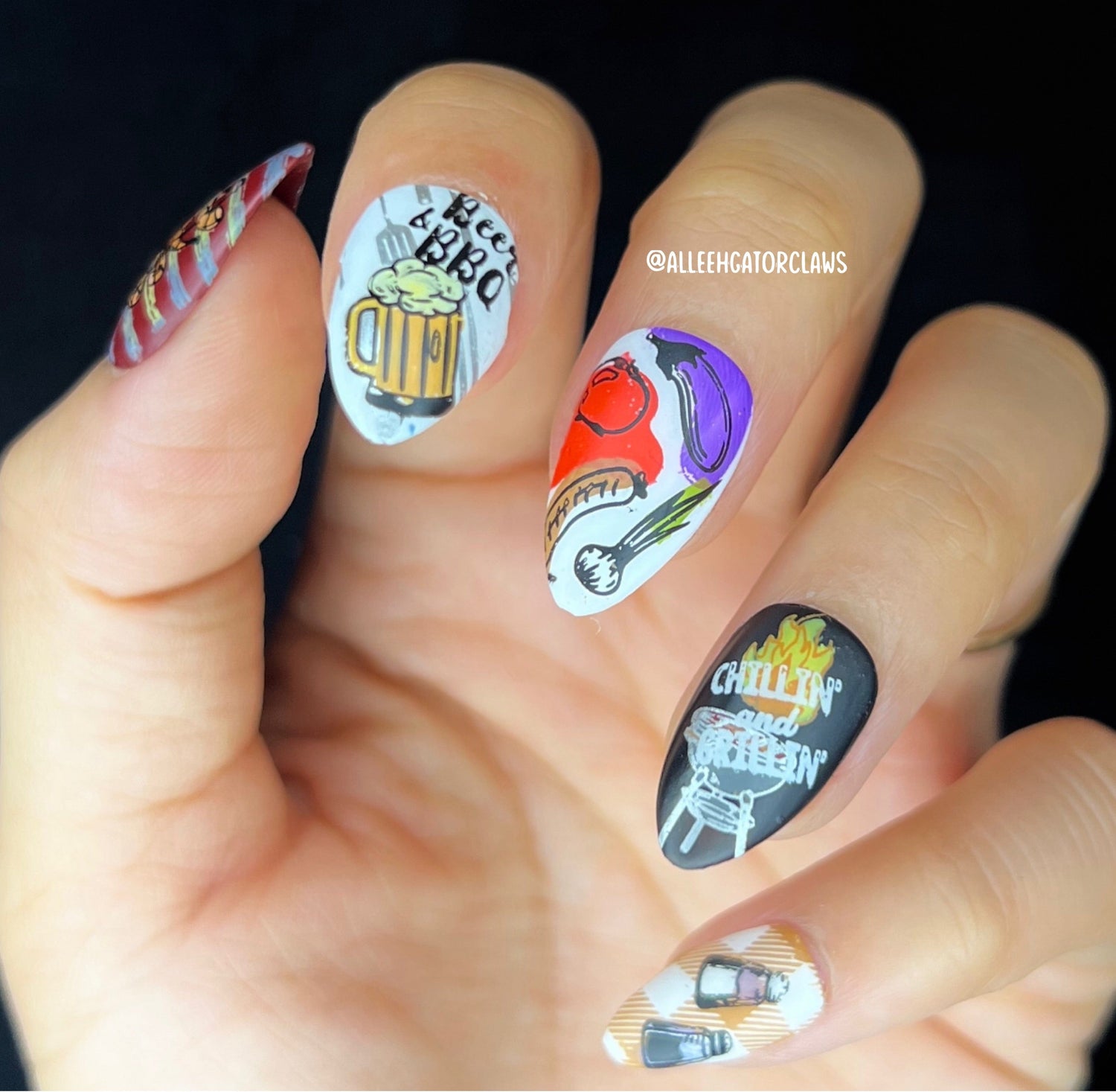 This is un-grill-ievable! The Chillin' and Grillin' plate gives you some flippin' great nails with a variety of accent designs and 4 full nail patterns to choose from. This plate is loaded with all the mouthwatering grilled foods to celebrate your summer vibes. Get a healthy serving of meat, fish, and seafood, all charred to perfection, with some grilling tools and topped with savory sauces. We're getting all fired up with a smokin' hot nails!