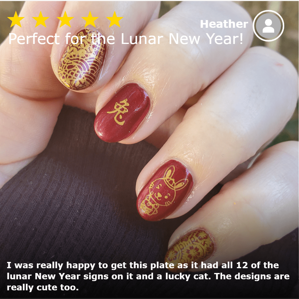 features abundant full nail and accent designs. Stamp for good luck with the 12 zodiac animals, lanterns, door couplets, firecrackers, red envelopes, and more. Ring in the new year with your favorite cute lucky charms!