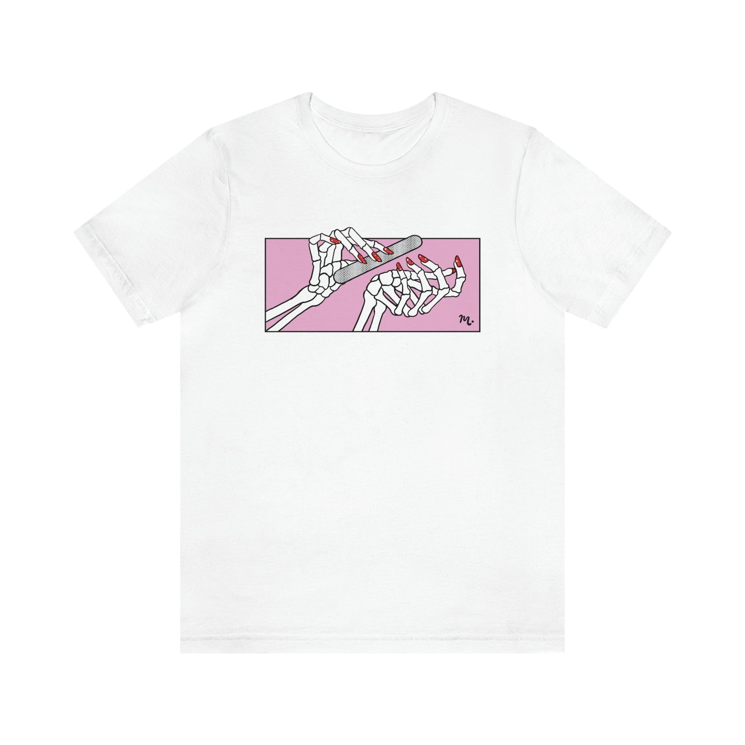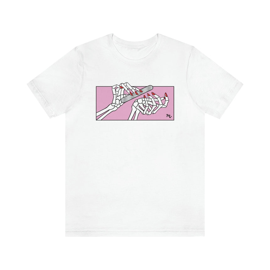 You don't have to be a nail art expert to rock this shirt! Our "Dead But Nailed It" design is a conversation starter. It's a bold and hilarious addition to any closet, and is sure to be your go-to for casual days. Plus, it's comfortable enough to wear all day long while you work on perfecting your next manicure. Bring a little life to the afterlife with this stylish and edgy t-shirt!