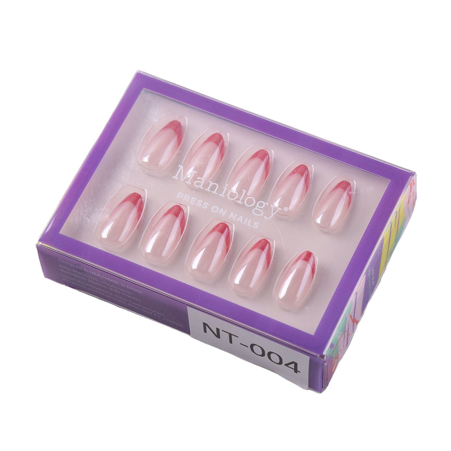 For Nail Glue: Apply an even layer of glue to natural nails and the back of press-on. Place press-on nails with cuticle line and apply. Press and hold for 10-20 seconds to secure.