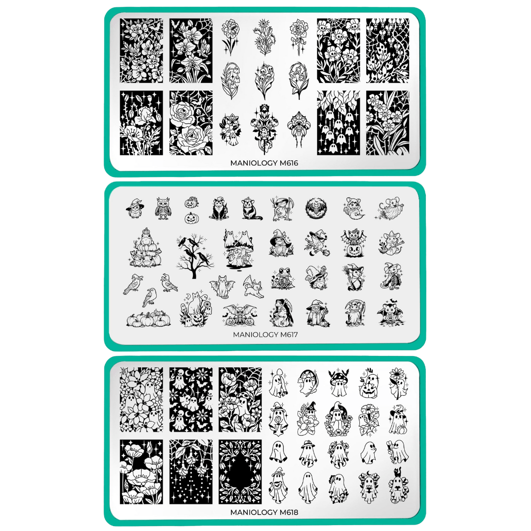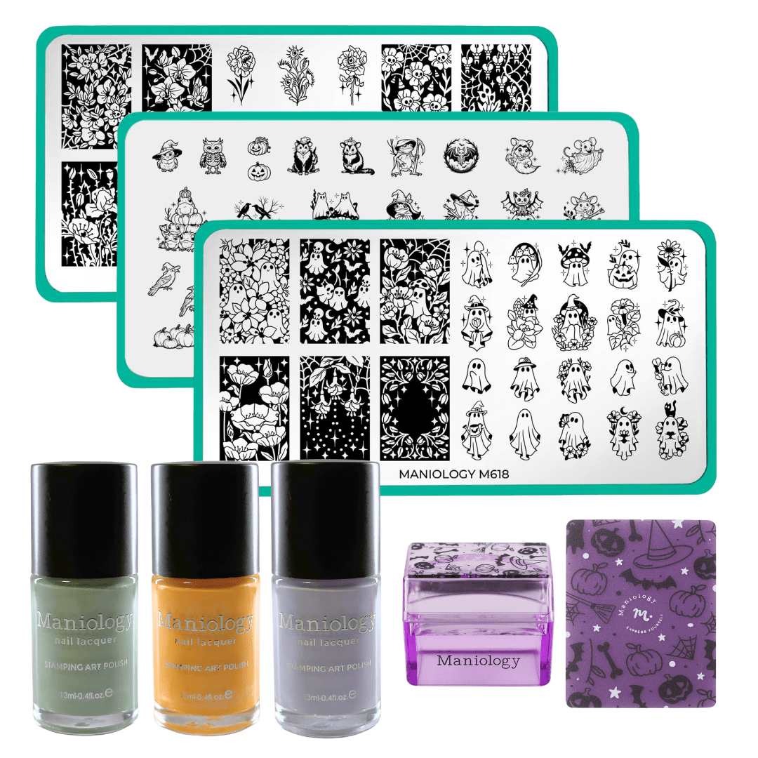 Plant the seeds of spooky creativity with our Ghoulish Gardener nail stamping bundle. This kit includes twisting haunted plants, mischievous familiars, and silly little spirits that love to haunt your nails. Enchanting pearl polishes make it easy to stamp your look and create Halloween nail art that’s darkly elegant, mischievously magical, and adorably spooky. Let your creepy garden grow and make your manicure creep and bloom.