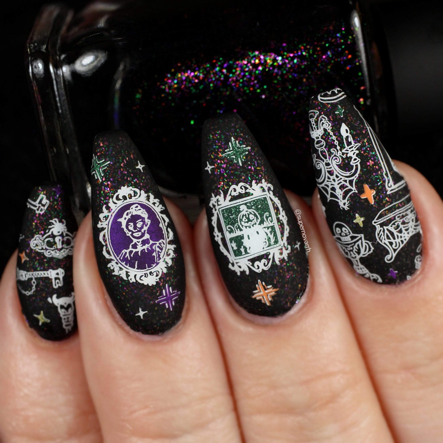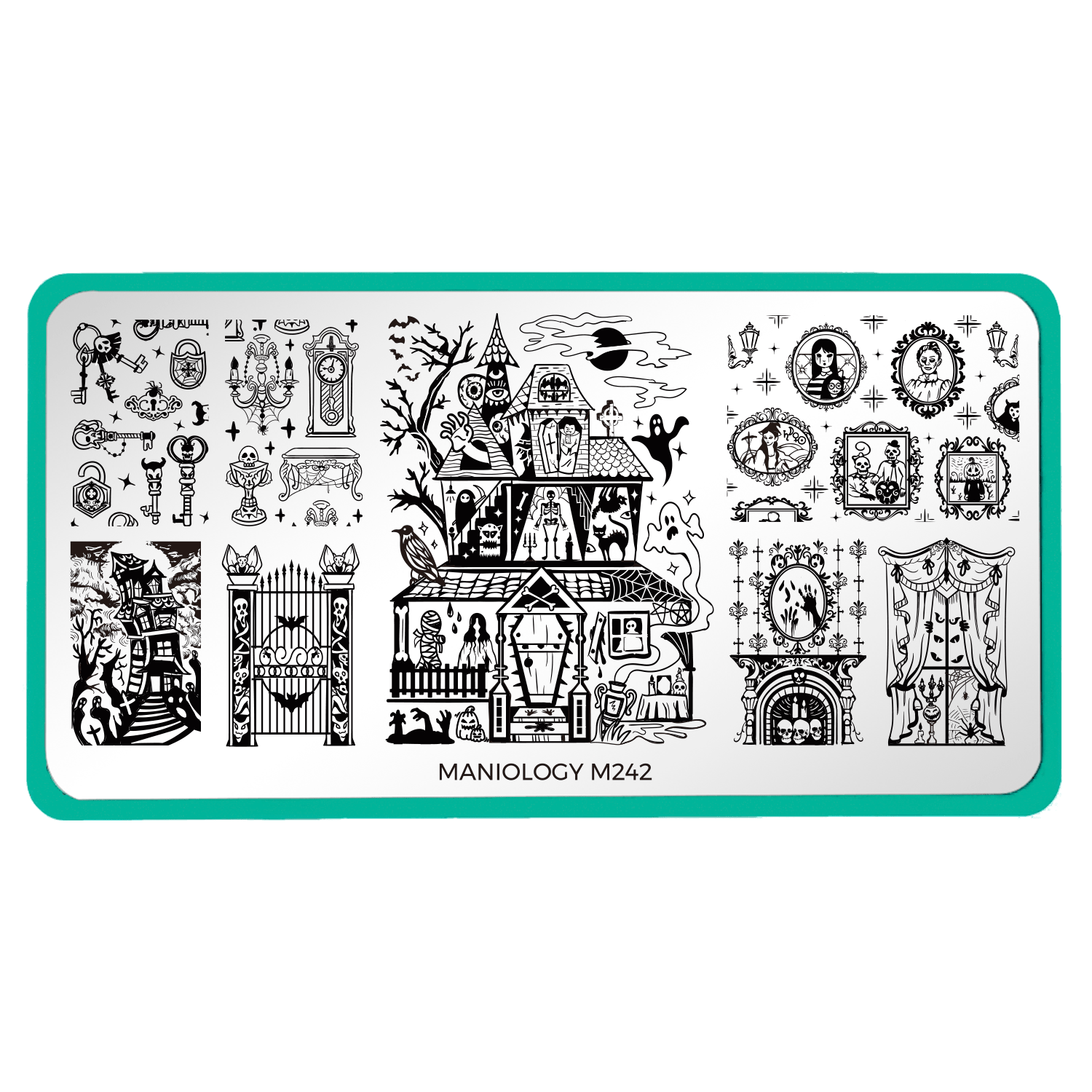 You are cordially invited to our Halloween celebration. Make yourself at home in Maniology manor. Don't mind the cobwebs. This homely stamping plate is embellished with victorian inspired decor and a hall of peculiar portraits. (Don't stare too long.) Warm up your frigid fingertips in our fireplace or unlock your creativity with one of many skeleton keys. Make yourself at home and get creative with your Halloween manicures.
