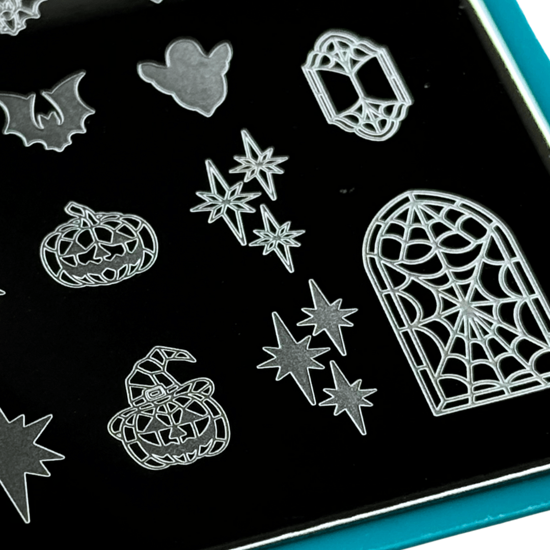 For nail art that feels magical under moonlight, our Moonlit Mosaic stamping plate offers hauntingly beautiful patterns. Create mosaics that shimmer with mystery and enchantment with stained glass-style pumpkins, ghosts, and gothic arches, perfect for layering and creating a mysterious mosaic of Halloween magic.