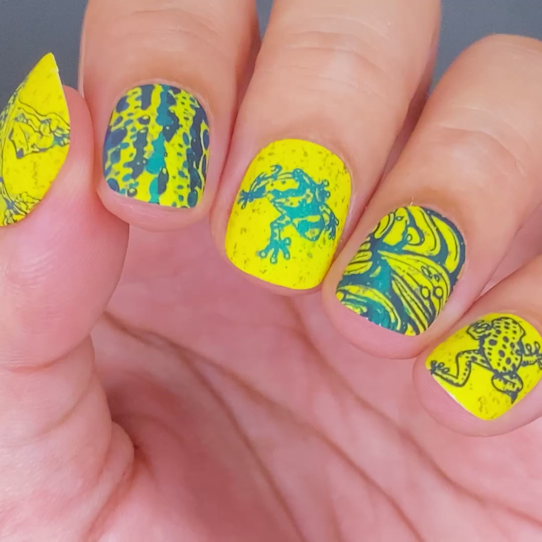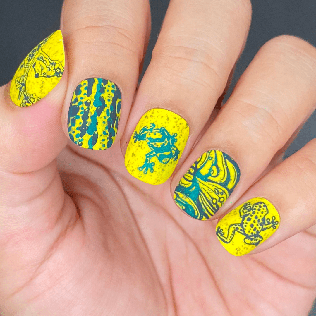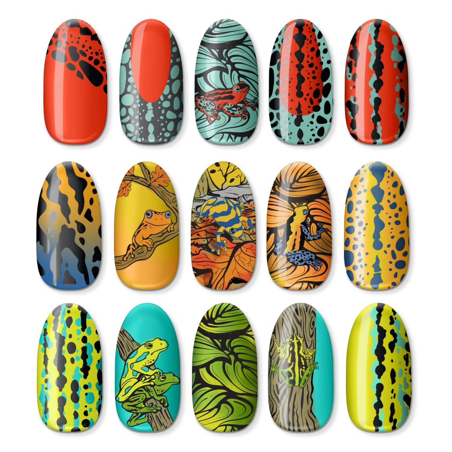 Get toadily insane with this Hop To It nail stamping plate! This plate features a variety of rainforest and poison dart frog designs. Your new manicure will be so cute, it could even attract a prince! Hop right in and create un-frog-ettable manis with these fun and quirky stamping plate.