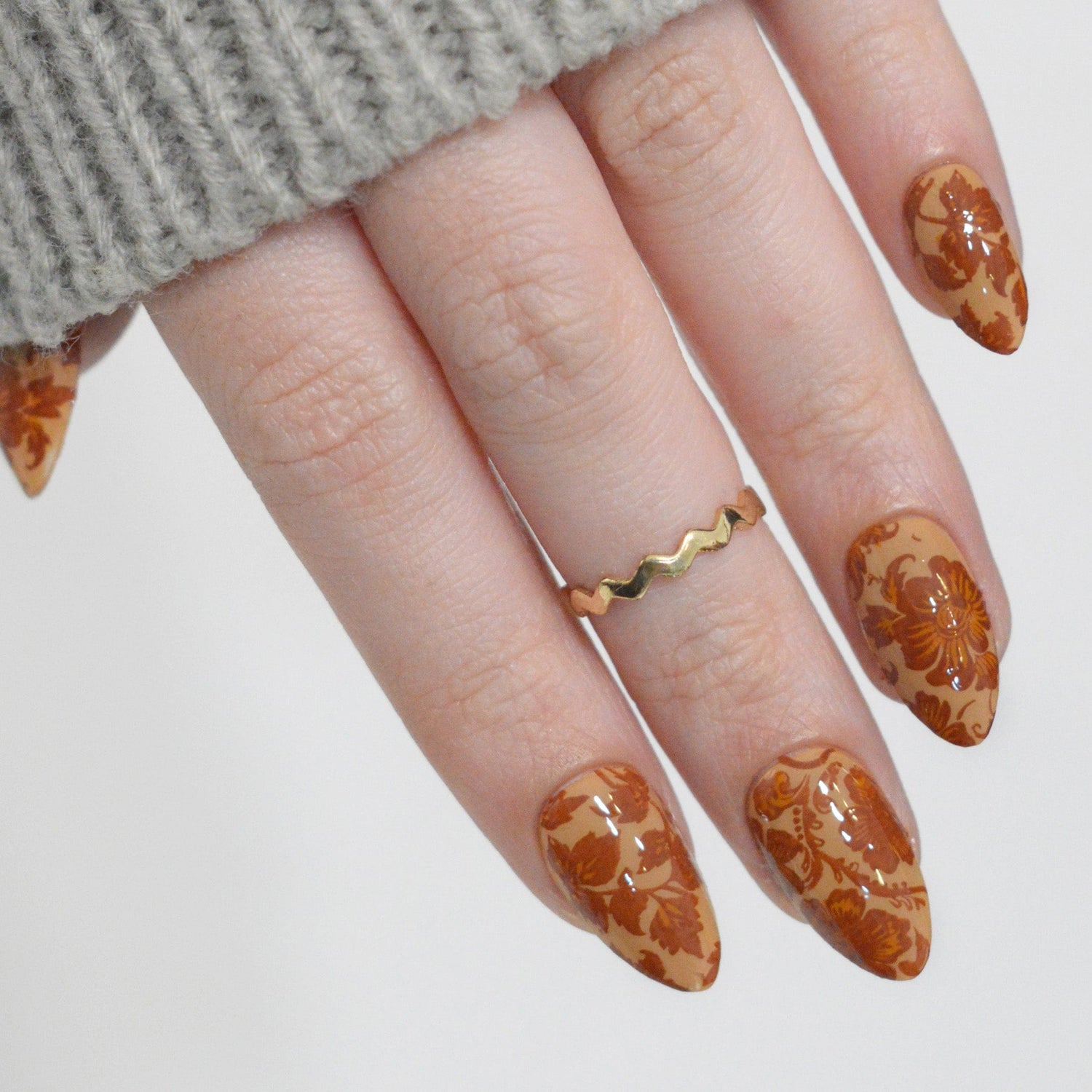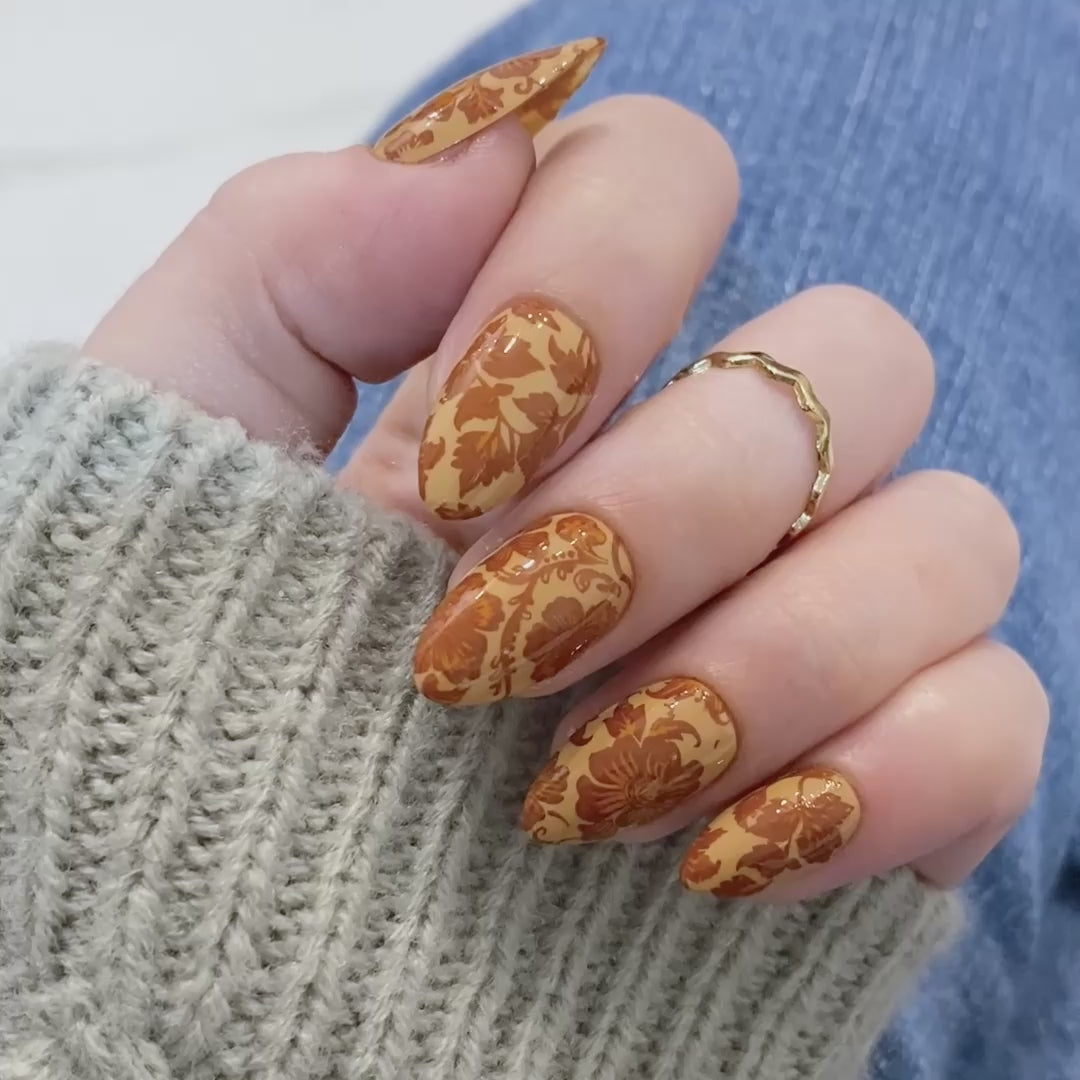 Our Leathercraft stamping plate features intricate floral carvings, leafy scrolls, and ornate botanical patterns inspired by carved leather designs. These patterns mimic that engraved, textured look bringing out the warm, rustic artistry of leatherwork mixed with the beauty of botanical detailing. Pairs beautifully with earthy tones and warm natural shades, perfect for rustic nails or boho-inspired look.