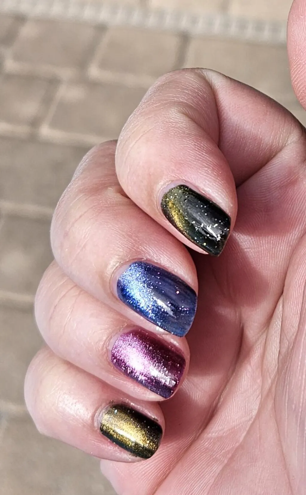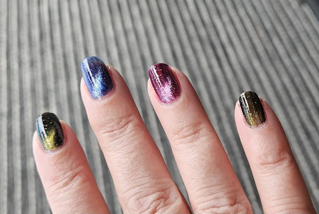 To use magnetic nail polish, place the wand close to your nail—either under the nail while polishing or just above the nail after polishing. You’ll want to do this for each layer to get the best effect. Apply a coat of the polish to each nail, then immediately use the magnetic wand and hold it close for about 30 seconds to create the desired effect. The magnet will draw the magnetic pigments in the polish, creating a unique and sparkly finish. Once the design is set, apply a top coat to seal it all in. You can use the magnetic wand again after applying the top coat to lock in the magnetic effect.