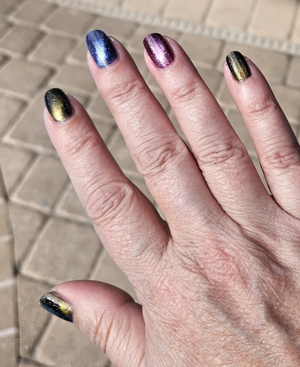 Drench your nails in holo stardust and shifting galaxy colors with our Lost in Space nail polish set. This collection comes in 3 cosmic, color-shifting shades that shimmer and sparkle like they were bottled on another planet. Alien Energy flashes green to gold, Astral Dream beams in a red metallic shimmer, and Cosmic Mirage gives that royal deep-space blue effect, all dusted with silver holo glitter scattered like stardust. Each shade transforms under a magnet, creating a shifting light effect. Each bottle contains 13ml of nail polish. Use a magnetic wand to create stunning magnetic galaxy effects. Take off with this full set and let your fingertips go full intergalactic.