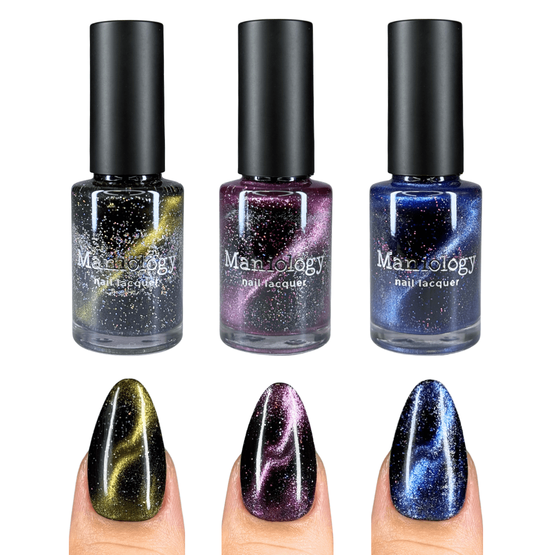 Drench your nails in holo stardust and shifting galaxy colors with our Lost in Space nail polish set. This collection comes in 3 cosmic, color-shifting shades that shimmer and sparkle like they were bottled on another planet. Alien Energy flashes green to gold, Astral Dream beams in a red metallic shimmer, and Cosmic Mirage gives that royal deep-space blue effect, all dusted with silver holo glitter scattered like stardust. Each shade transforms under a magnet, creating a shifting light effect. With every set, comes a free magnetic wand, and each bottle contains 13ml of nail polish. Use the free magnetic wand included with this set to create stunning magnetic galaxy effects. Take off with this full set and let your fingertips go full intergalactic.