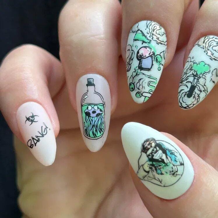 Let's do a little nail experiment...! Explore your strange curiosities with our Mad Scientist (m331) stamping plate. From DNA strands to laboratory equipment, this plate features fizzy-fun designs perfect for showing off your love for science. So get ready to experiment and mix up some magic for a bubbly-blast nail art!