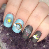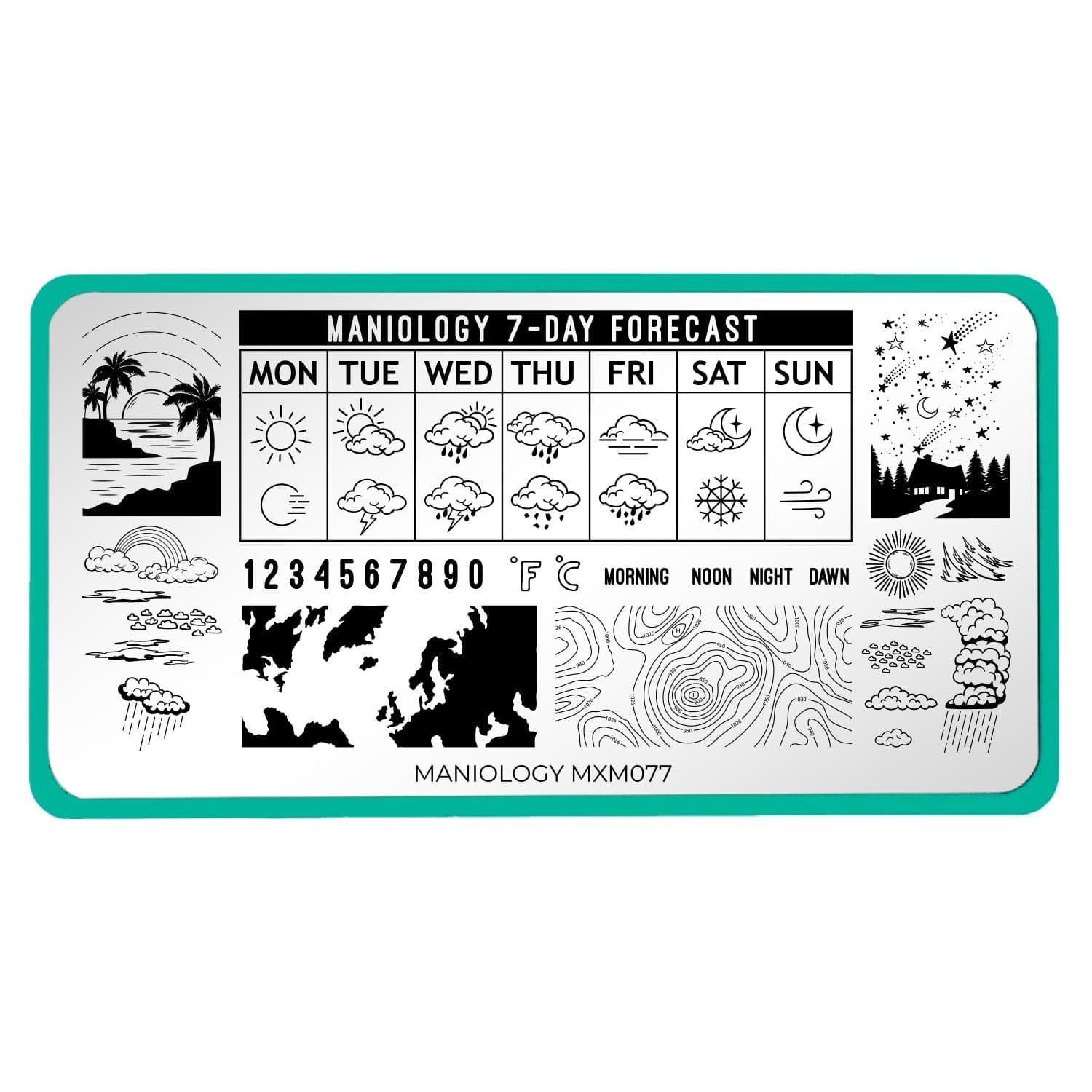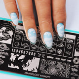 You don't need weather reports when you’ve got nail art that forecasts fun! The Weather Forecast stamping plate brings you a week of weather design inspirations—sun, clouds, rain, and even late-night meteor showers. You can build your own 7-day outlook with day names and weather icons, perfect for creative nail planners. Whether you're matching the real weather or just going with your vibe, this plate makes it easy to mix it up.