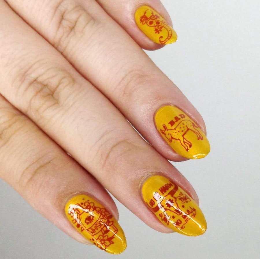 • RIDE ON: Traverse the desert plains with a golden yellow duo-chrome stamping polish with shifting glints of amber sparkles.