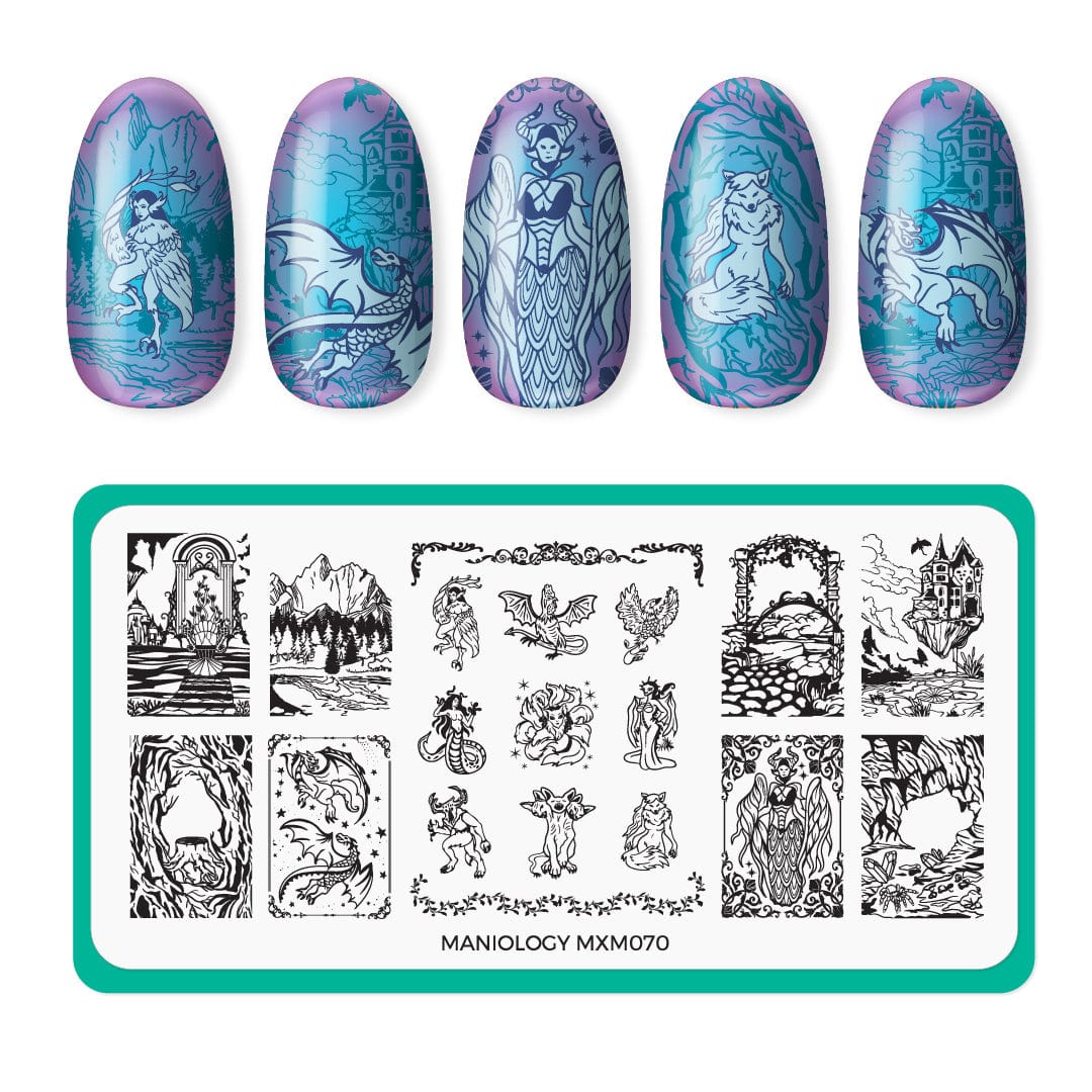 Enter the realm of scales, shadows, and smoky secrets! The Horns & Flames stamping plate is a portal to a dark, enchanted world where. It's forged in fire with fearsome mythical creatures like dragons, horned beasts, other cryptid curiosities, and sinister full nail patterns of eerie forests, twisted woods, lava-lit cliffs, and otherworldly realms, all ready to awaken your fiery spirit.
