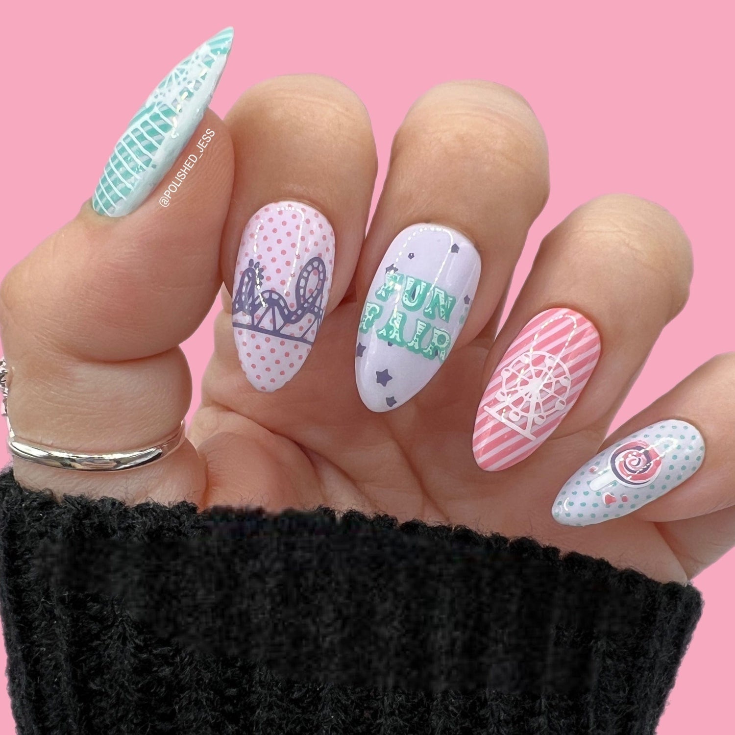 Get your nails in line—this ride is all style! Take your nails on the ride of their lives with the Tickets to Fun plate! This whimsical wonderland includes classic carnival elements like Ferris wheels, roller coasters, candy treats, game stalls, balloon critters, circus performers, popcorn buckets, circus tents, and more joy-filled fairground favorites. Snag your ticket, and buckle up for your most joy-packed ride yet!