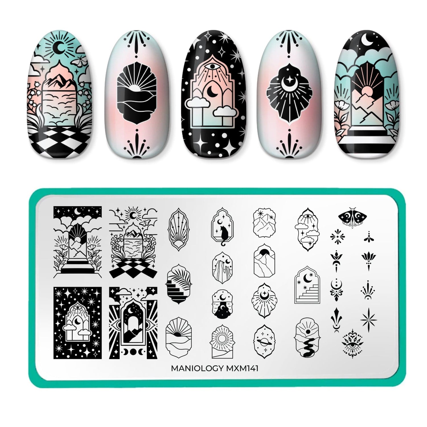 Peek through a window into another realm with nail art that reveals hidden magic. Glimpse Beyond stamping plate opens doors to magical worlds right at your fingertips. Featuring ethereal portals, mysterious windows, and celestial symbols, this plate creates magical gateways that make your nails truly spellbinding!!