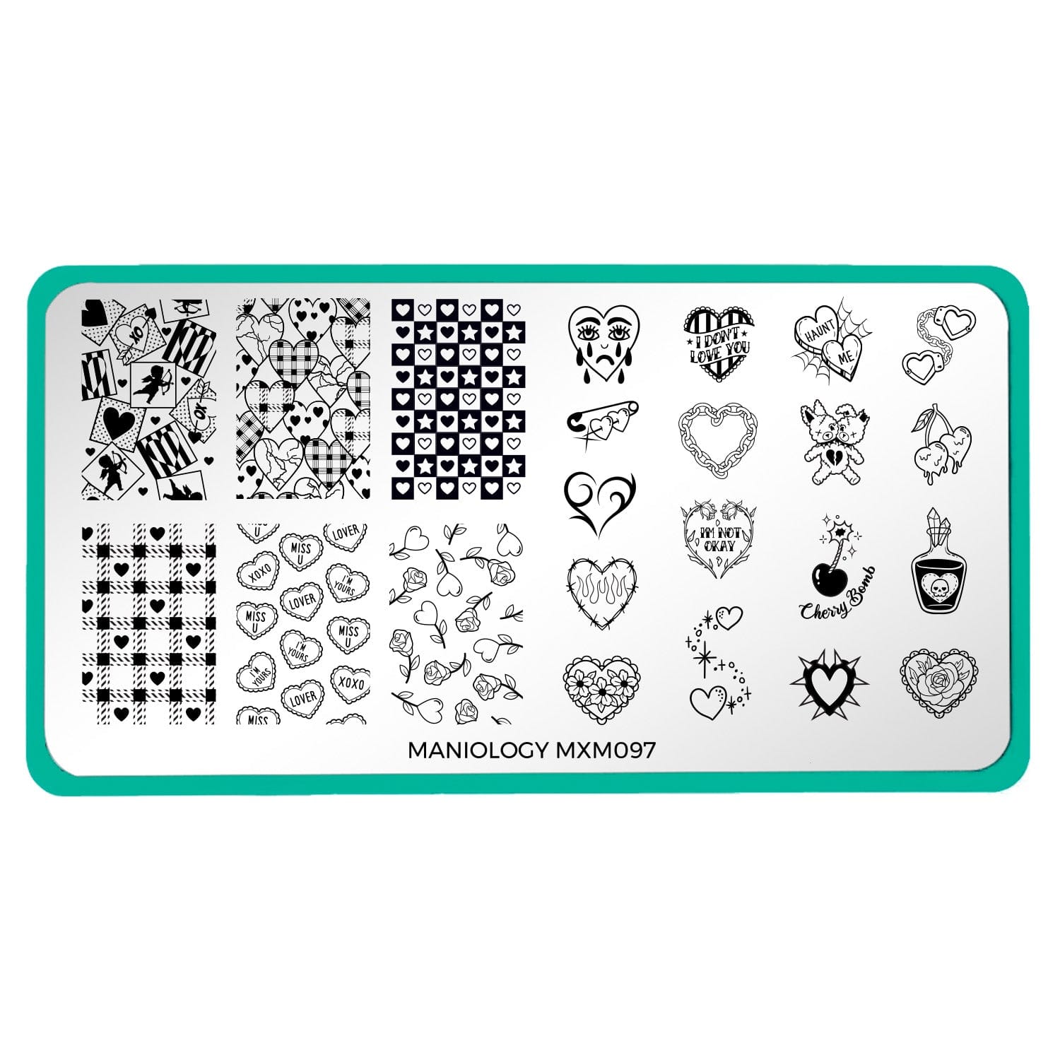 Built to break hearts! Handcrafted stamping plate is for the romantics who love a little edge. Soft on love, sharp on style! This plate features full nail patchwork patterns and edgy accent designs straight from your favorite alt love story. Think crying hearts, heart handcuffs, chains, spiked and barbed wire hearts, pierced hearts, love potions, and even a double-headed bear. If your love language is spiked jewelry and flirty glances—this plate is basically your type.