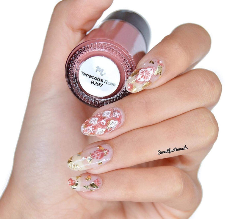 Create a masterpiece worth showing off with Terracotta Rose (B297), a light, warm rusty red. Stamp over your favorite base color or paint onto the entire nail for flawless full coverage.