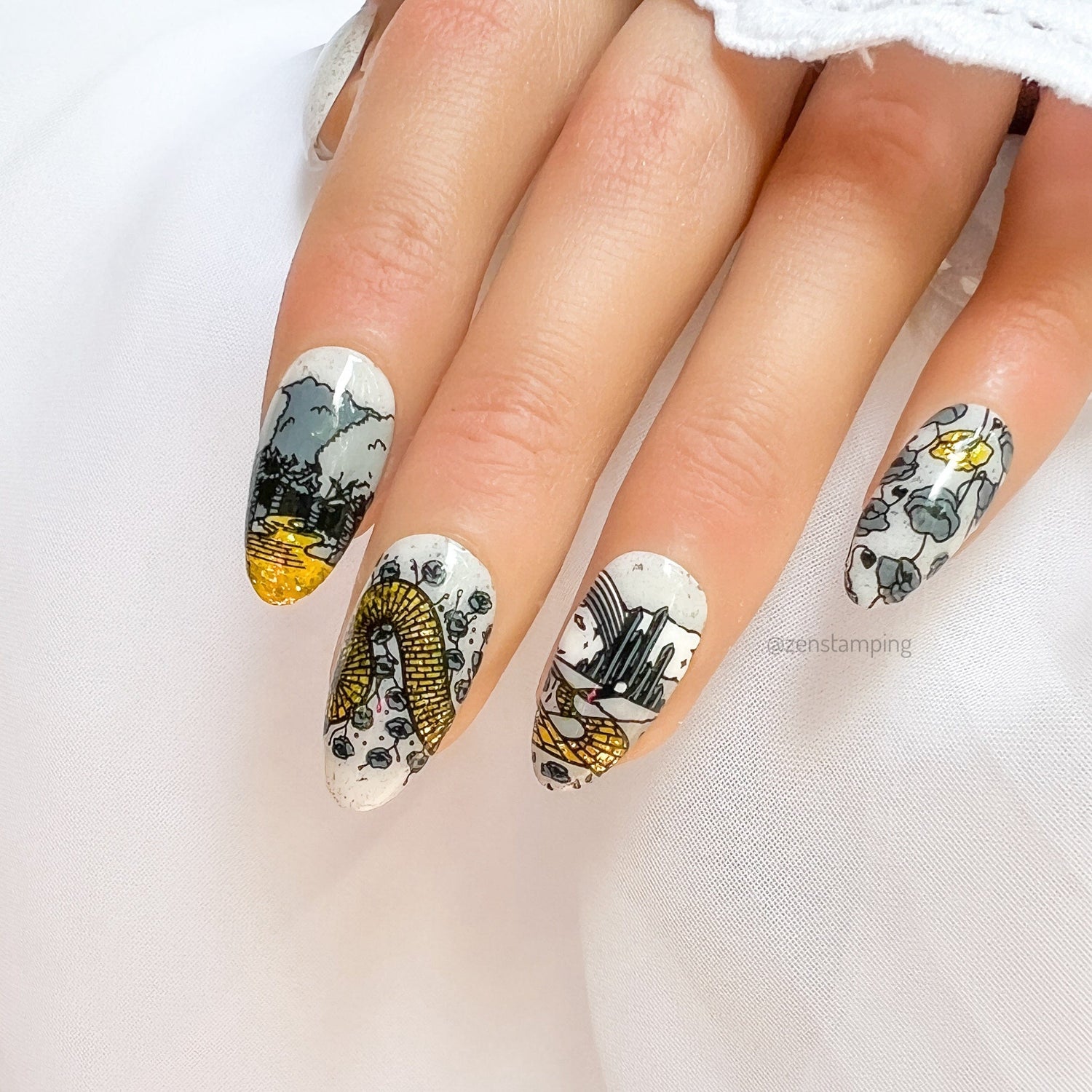 Your nails become a part of the enchanting journey as you step into the Land of Oz. This plate features beautiful, whimsical designs with scenes of the Oz landscape, including the yellow brick road, the wizard's castle, the Emerald City, and the mystical forests of Oz!