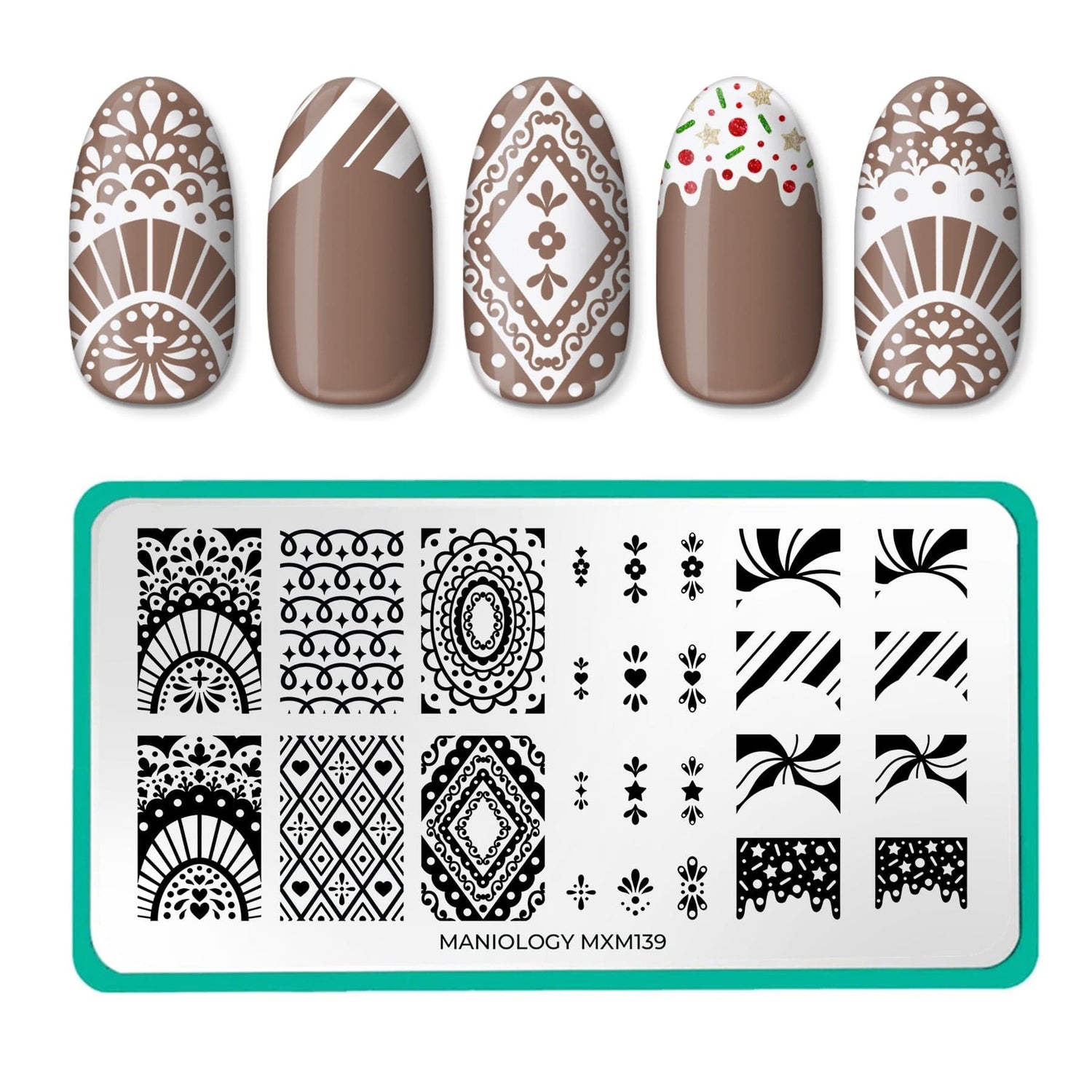 This holiday, your nails deserve a house party—gingerbread style! Deck the Dough constructs your manicure with the delicate details of gingerbread homes. Indulge in full nail and French tip styles featuring lace-like trims and fresh peppermint patterns. Made for the sweetest holiday nail designs, this plate serves up sweet nostalgia and candy-coated charm!
