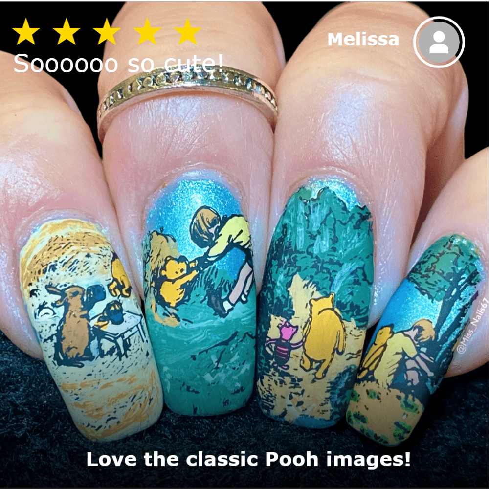 Gather your best pals, it's time for a nail adventure worth stamping! Tales from the Wood is a heartwarming trip into the whimsical world of Winnie the Pooh and his pals. This stamping plate is packed with character—literally! From the ever-optimistic Pooh Bear and his pint-sized sidekick Piglet to the gloomy charm of Eeyore, the bouncy energy of Tigger, the wisdom of Owl, the fuss of Rabbit, and the love of Kanga and Roo—every beloved friend is here. It’s cozy, nostalgic, and full of feel-good storybook charm.