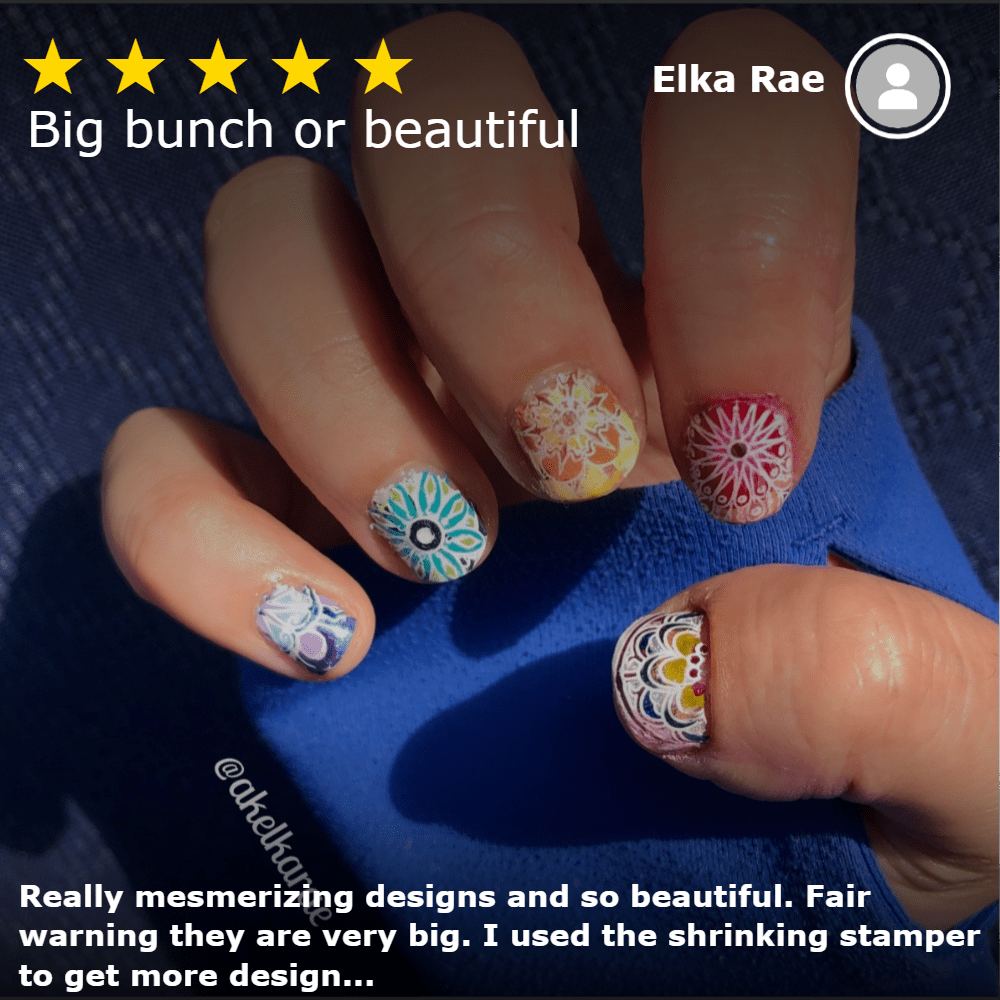 Get lost in a field of flowers with these geometric designs. We've combined our Earthly Medallions and Nature's Kaleidescope stamping plates to create this Mystic Woods XL revamp. These symmetrical full nail designs bring effortless details to your manicures in no time. Stamp from a variety of 12 floral-inspired designs that will bring you back down to earth in your next nail sesh.
