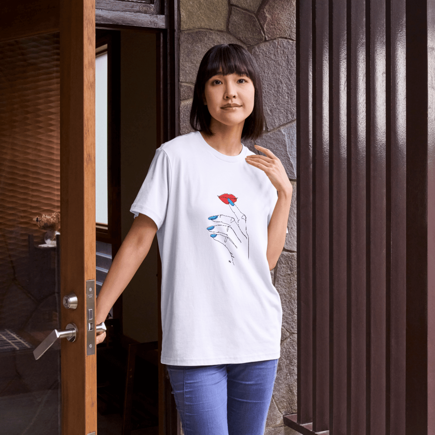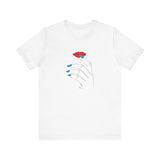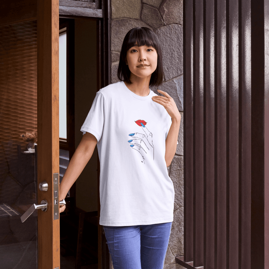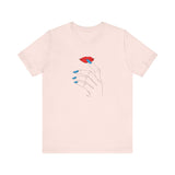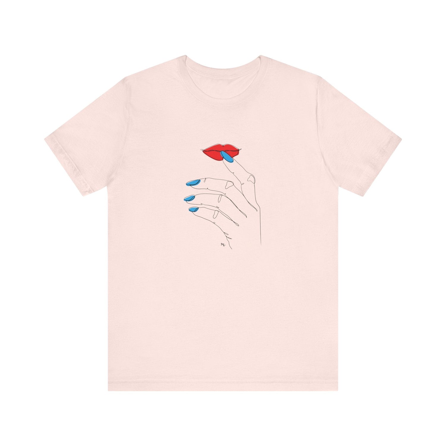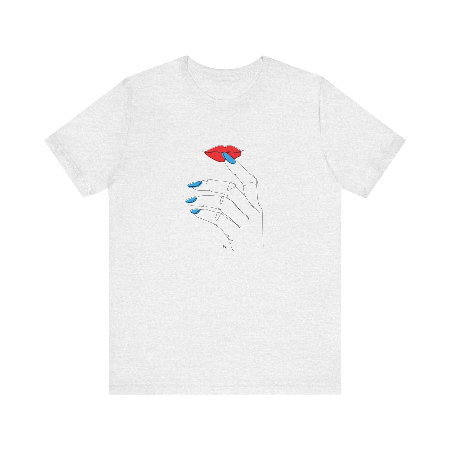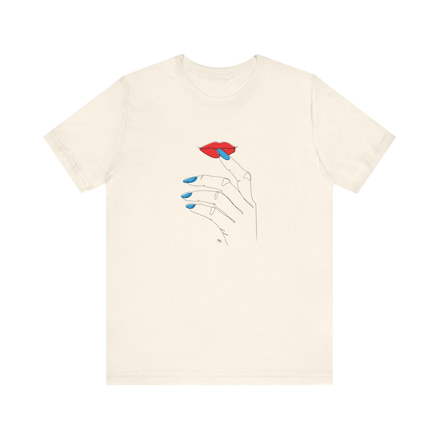 Bold, sleek, and stylish, this Nail Line Art shirt showcases an artistic line drawing of a poised manicured hand and lips in a striking pose. The pop of blue and red stands out beautifully against the minimalist black lines, creating a bold, creative statement. Its soft and comfortable fabric makes it great for everyday wear. Wear it to add a little edge, a little art, and a lot of style to your day!