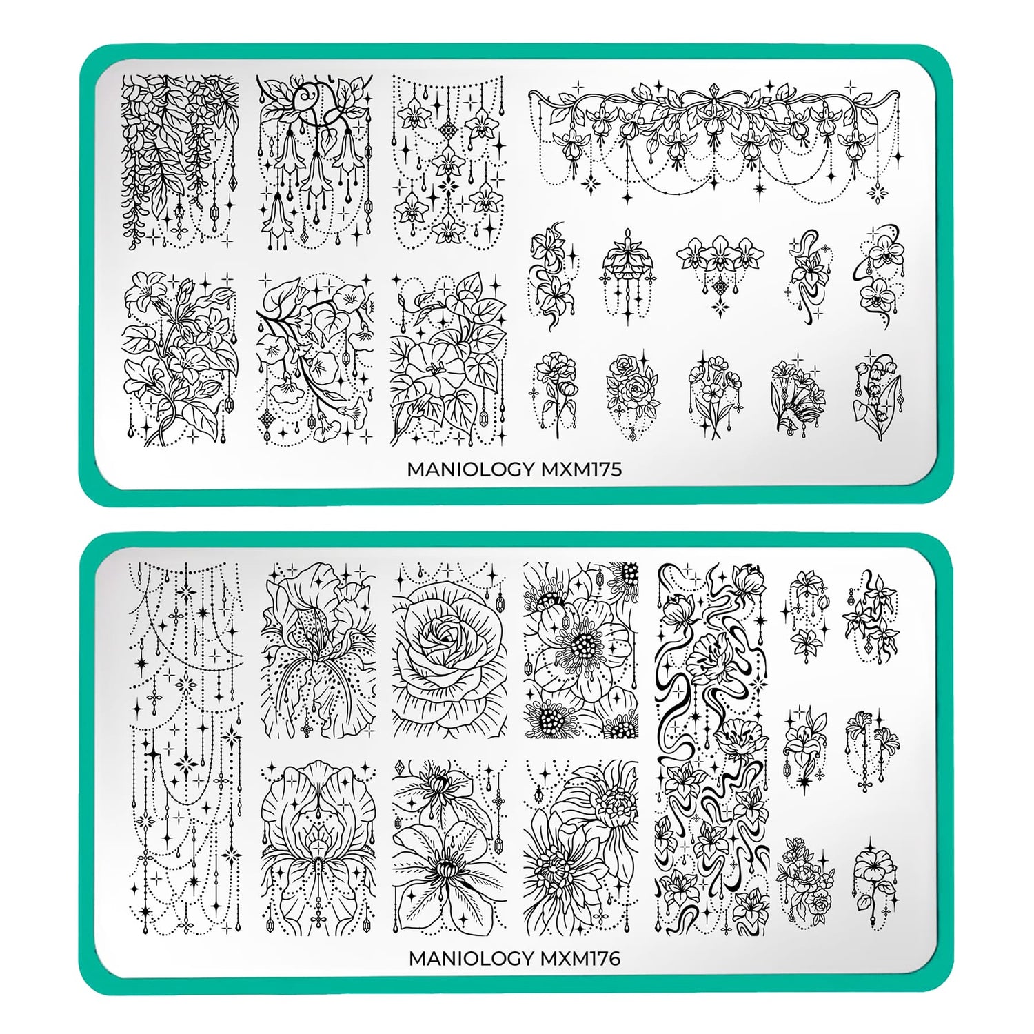 Diamond Dewdrop (MXM176) – Explore larger-than-life macro florals with enchanting dangling gemstones and fine sparkly accents. A long decorative design mimics a trail of stars, perfect for framing nails with magical glimmer.