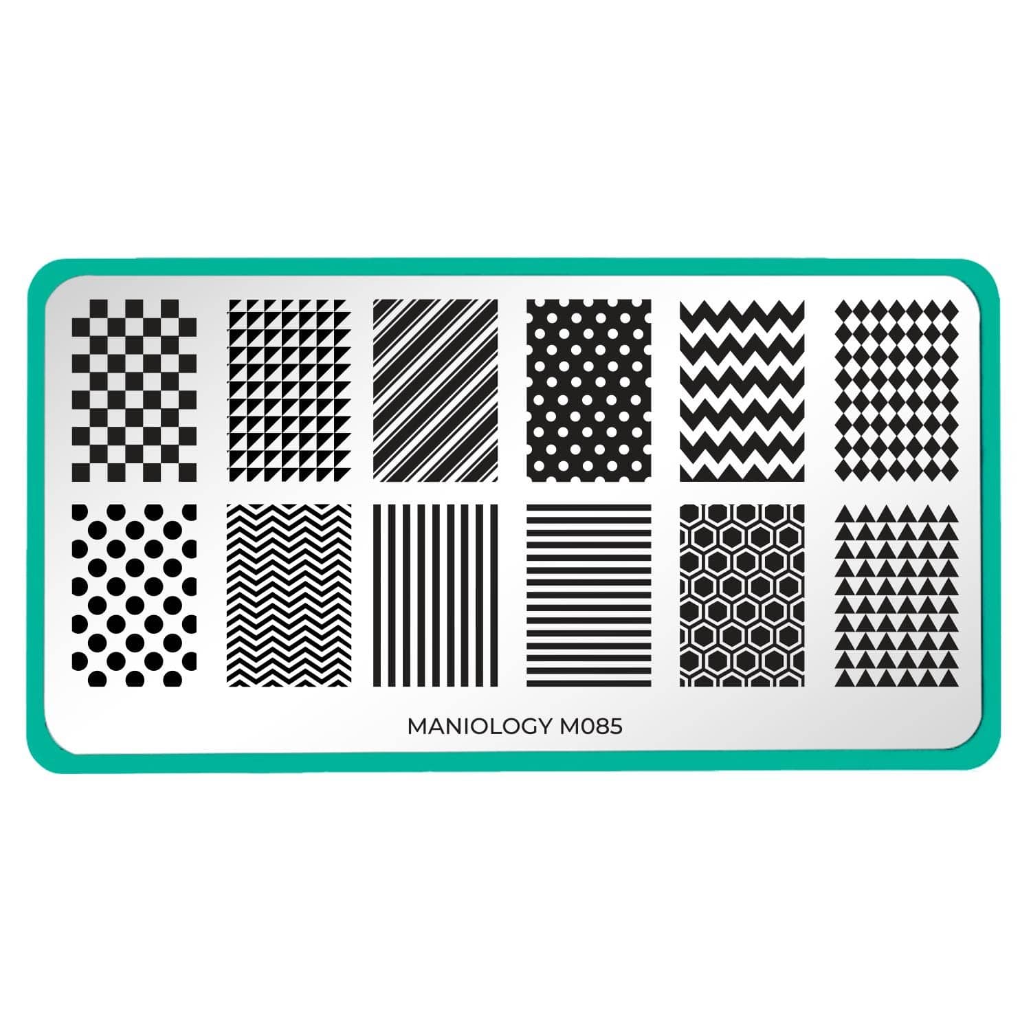 Our Patterns collection is back with XL-sized stamping plates! Walk the Line (m085) comes with 12 full nail designs featuring various stripes, chevron, polka dots, checkers, and more. This set will add some texture to any manicure with classic, versatile designs.
