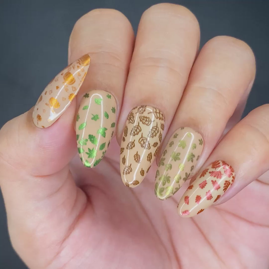 Bring the autumn spirit to your nails with Season Gradients! This nail stamping plate features 12 full nail gradient patterns, each with beautiful fall inspired design. Stamp cascades of leaves, pumpkins, cake, coffee, and more for the perfect beauti-fall gradient nails!