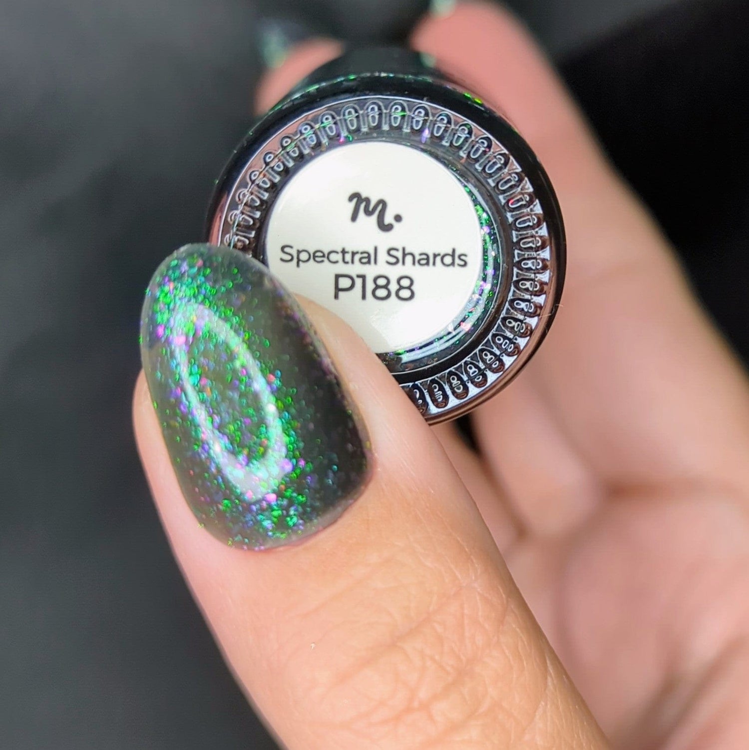 Transform your manicure into eerie, haunted glass with Spectral Shards (P188). This sheer, smoky black polish is filled with sparkling green flakies that shift like spectral light. Originally featured in our Haunted Reflections Mani x Me box, this shade makes your nails flicker like broken shards of enchanted stained glass.