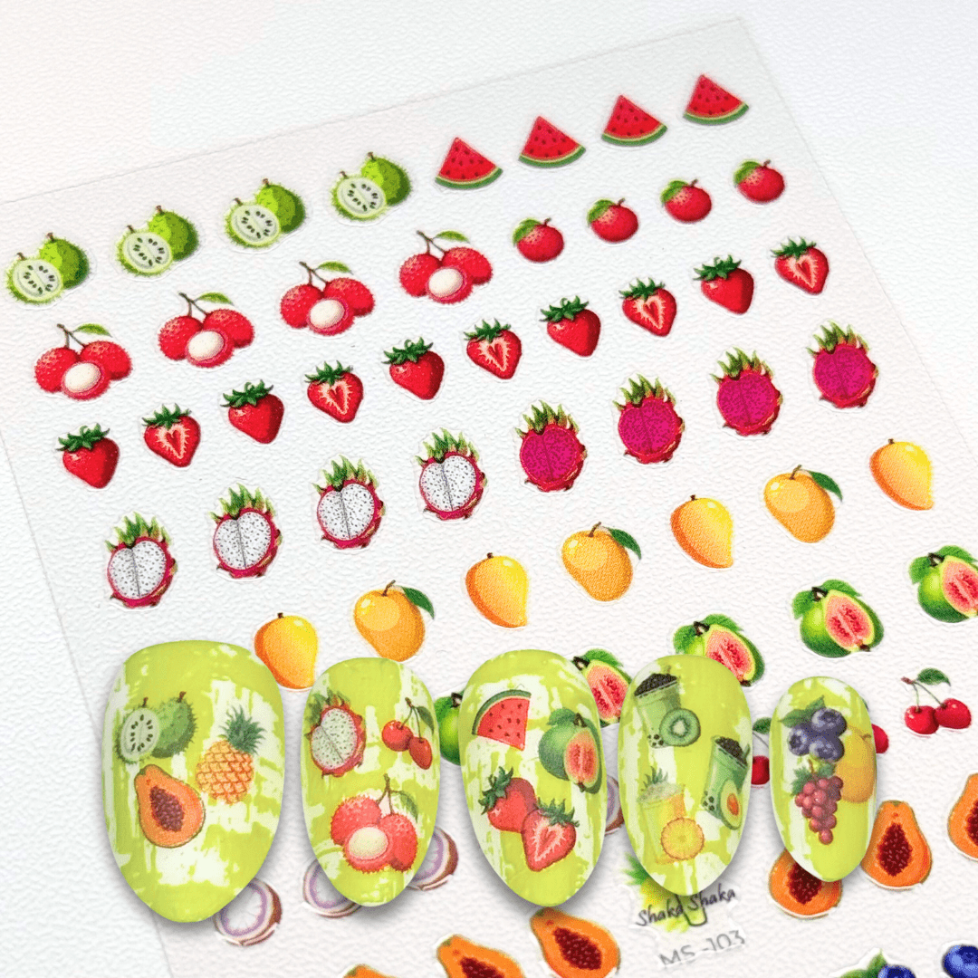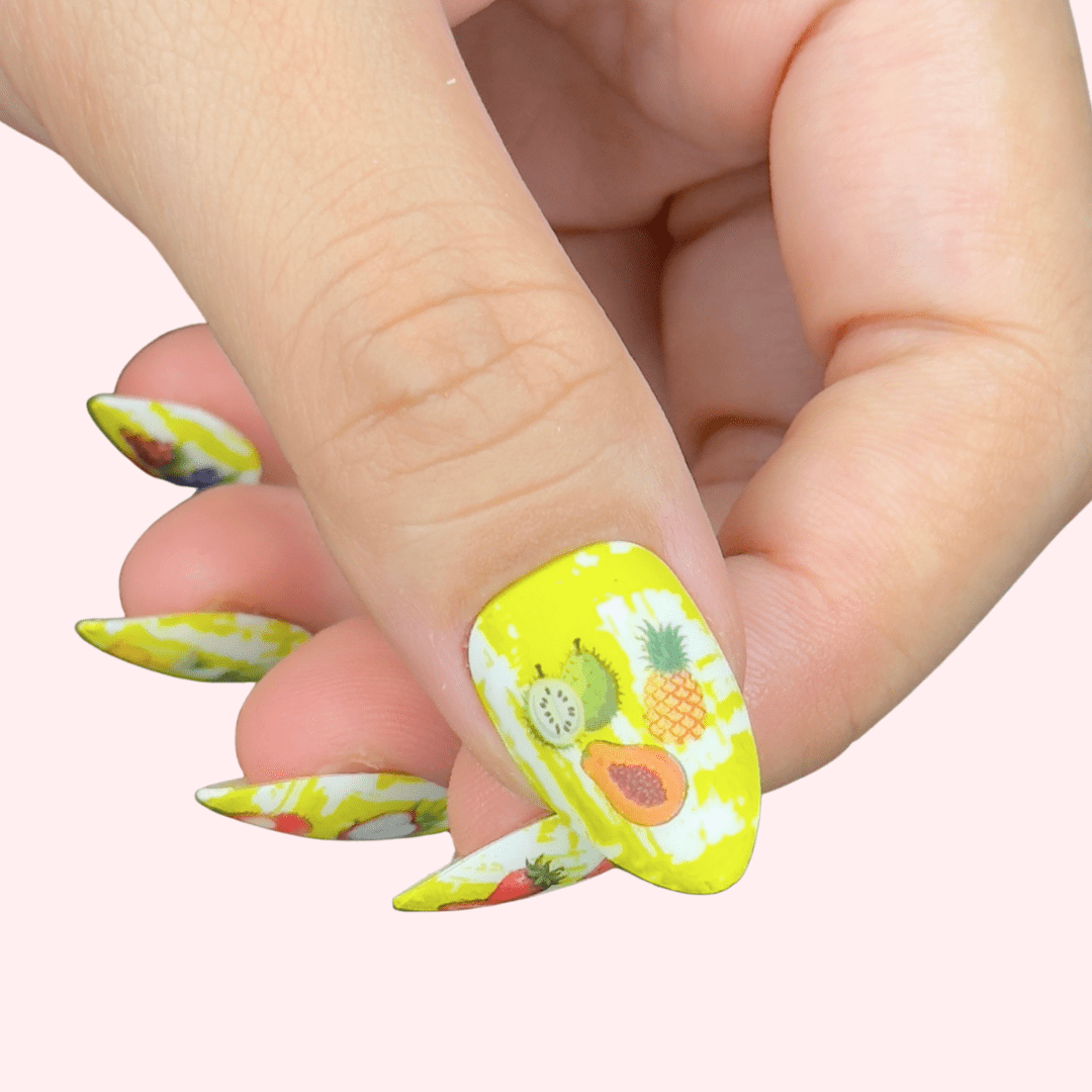 Serving fresh looks with a side of fruit! We teamed up with Shaka Shaka Tea Express, famous for their delicious fresh fruit drinks and high-quality teas, to blend up the ultimate mani smoothie. This fruity-fresh sticker sheet is bursting with sweet and juicy fruits plus refreshing smoothie cups! Each design is printed with high quality ink and pliable materials to hug the natural curve of your nails. The ultra thin backing creates seamless designs on the nail bed, so you won't have to worry about raised edges. Stick these on and sip your way to the cutest fruit-filled summer nails ever!